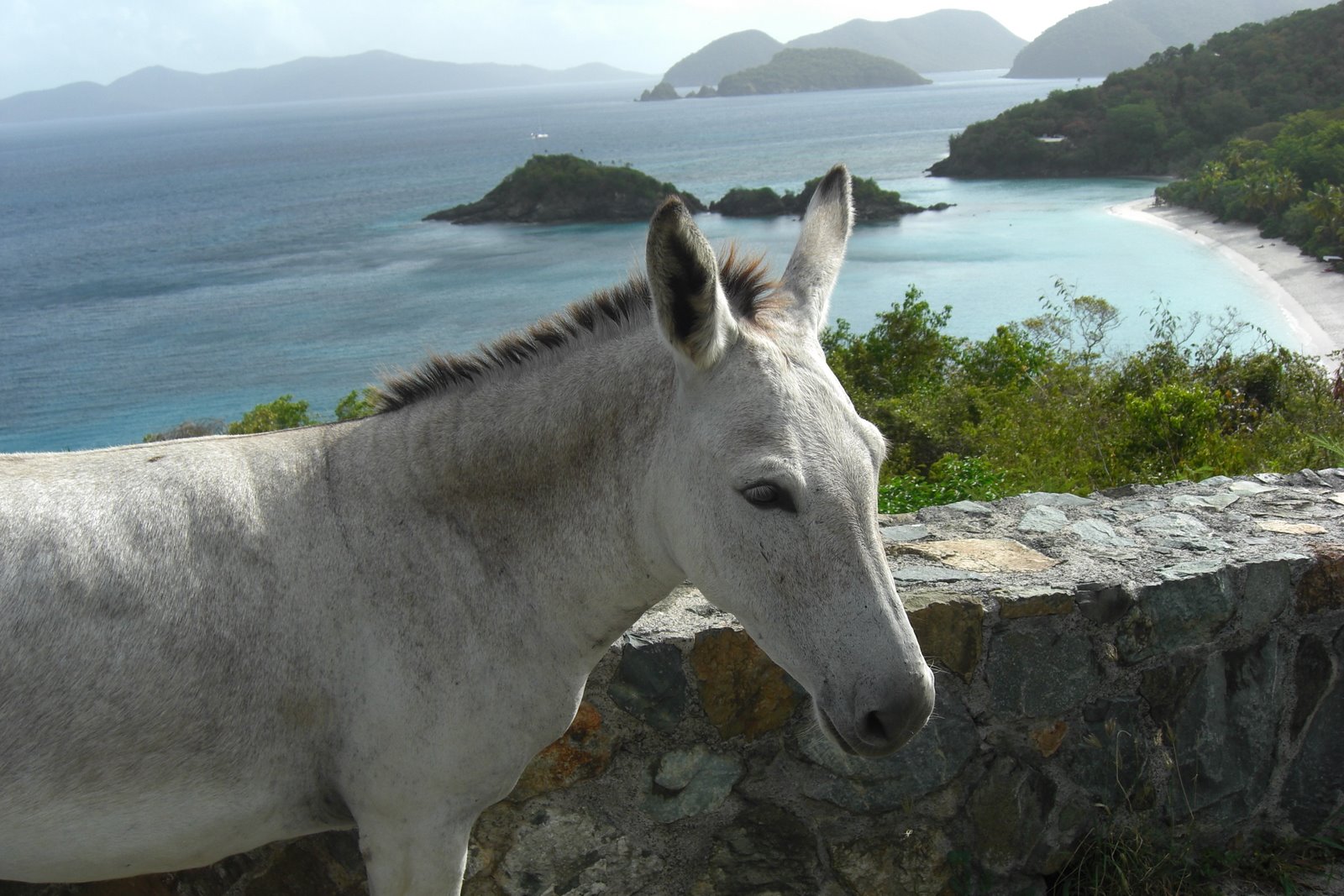 Many early mornings we will bring a coffee and enjoy breakfast parked above the beautiful Trunk Bay. One morning in June this fellow stopped by and posed for a photo. We later discovered the price of his pose was a bite or two of our breakfast.