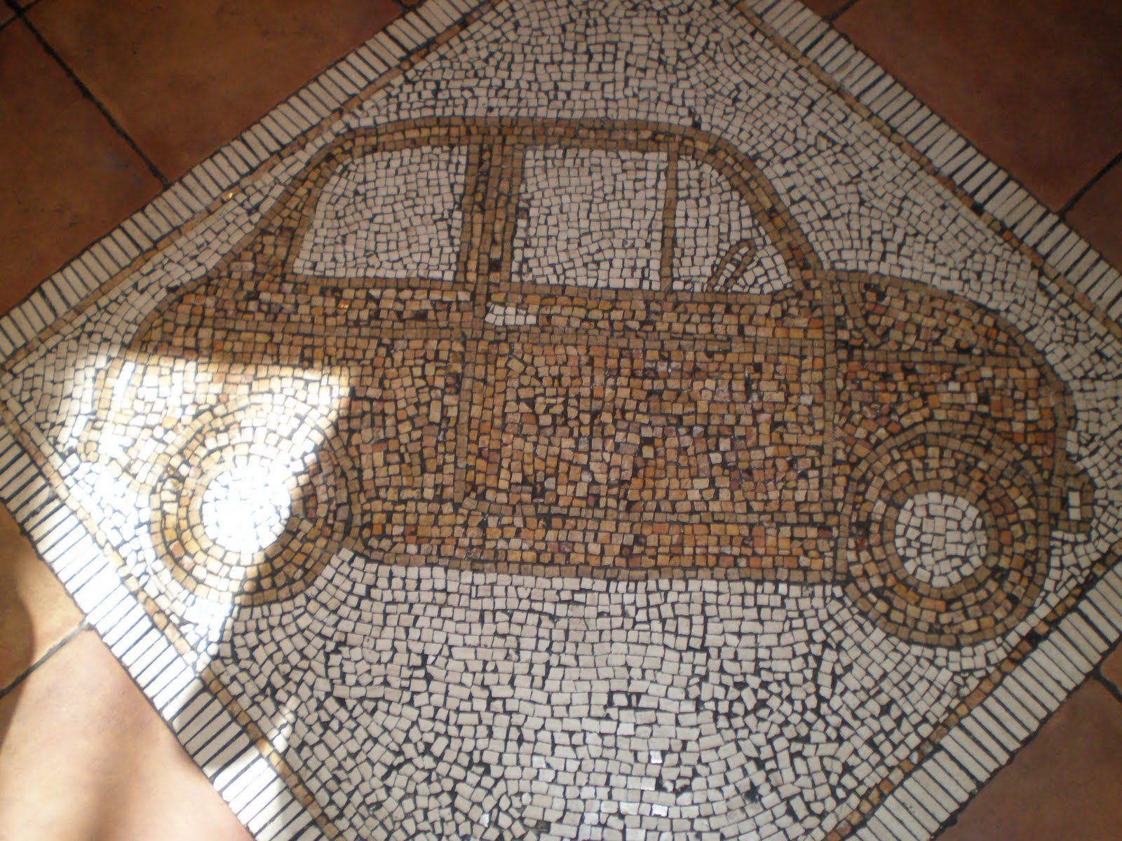 Bar 500 in Cortona Italy is a little cafe that serves up charm and plenty of great food. We stopped in for lunch and a few glasses of Italian wine. The place is named after the famous Italian Fiat 500 cars and on the floor of the restaraunt is a mosaic tile image of one.