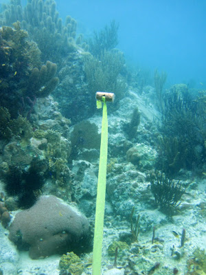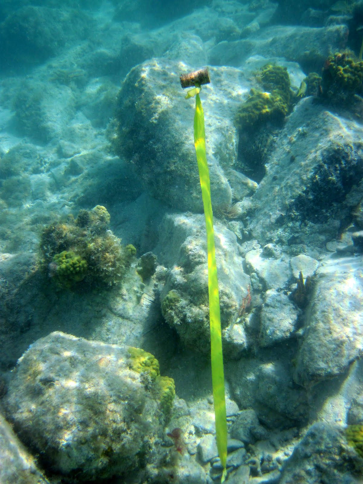 The Lionfish is responsible for killing native species of fish and is an unwanted invader of the caribbean waters. Pictured here is a marker that snorkelers and divers leave behind to document locations of known lionfish so the Parks Service can take action.