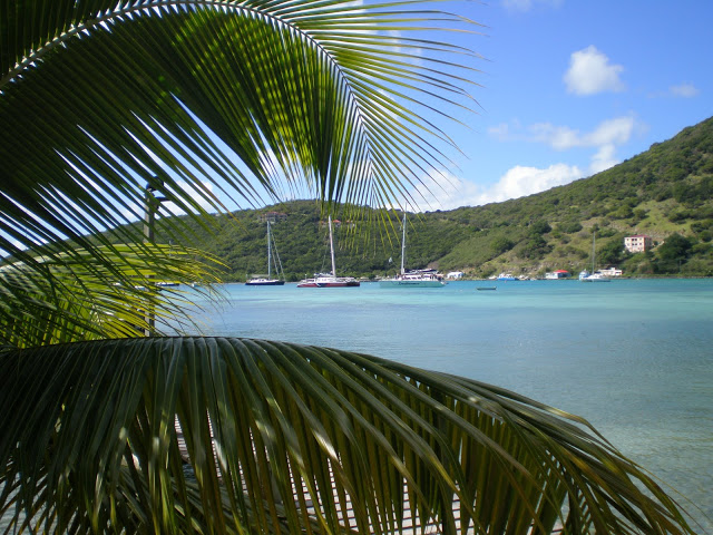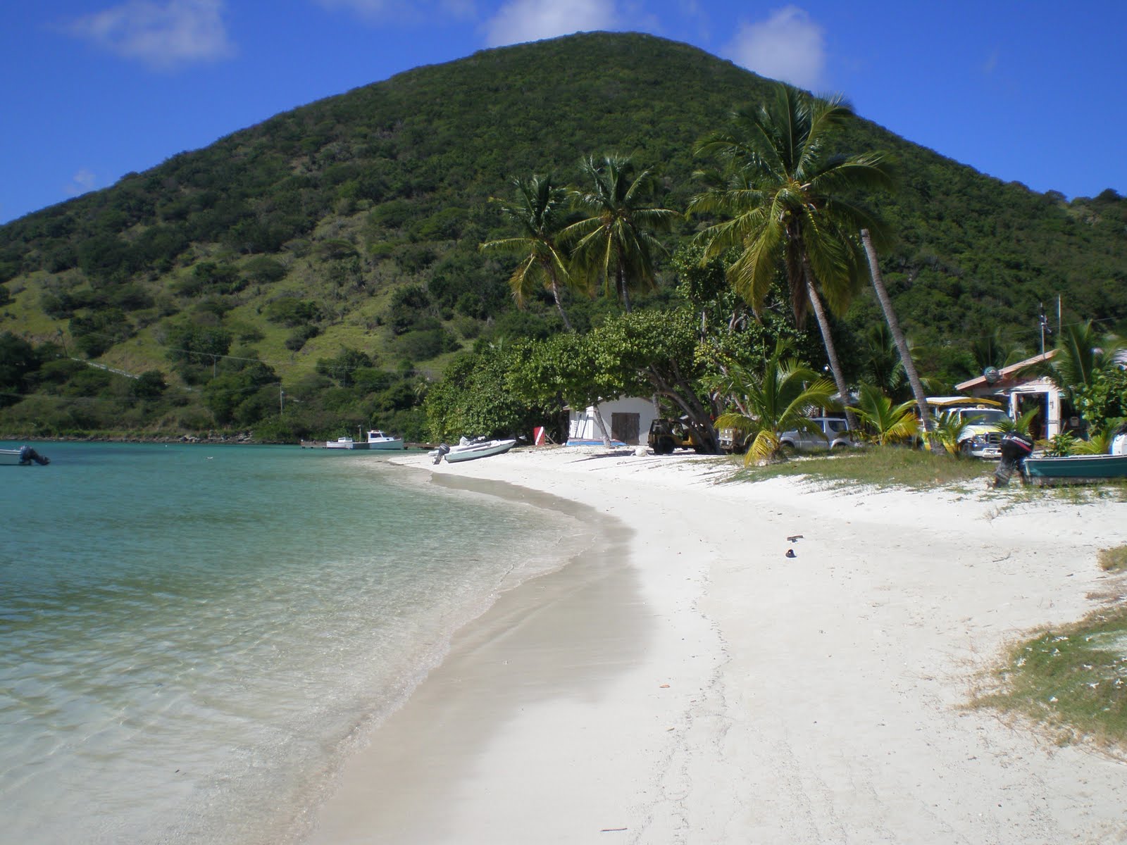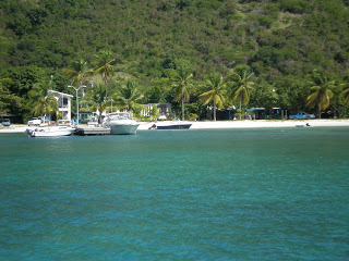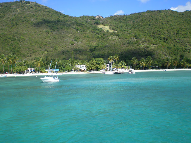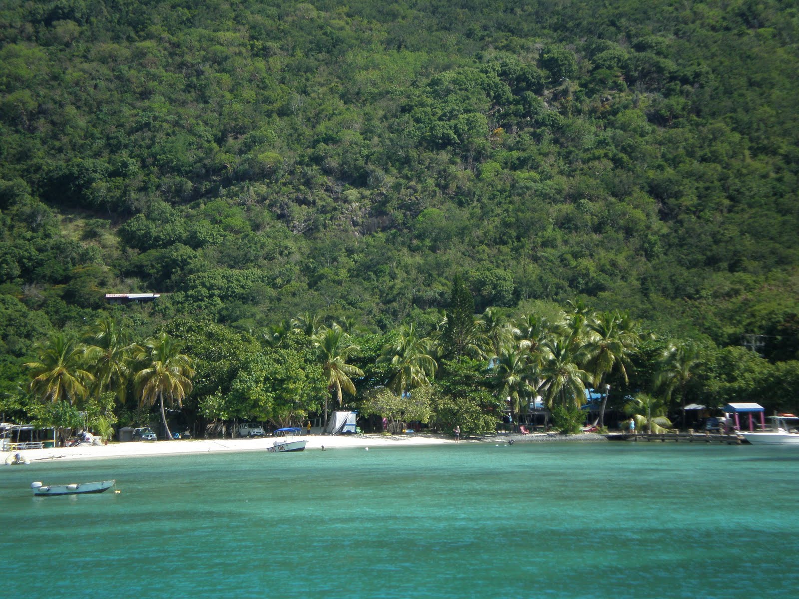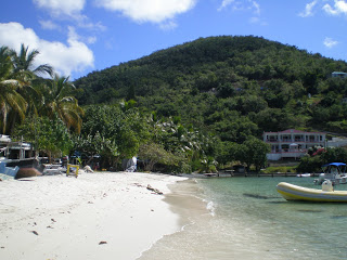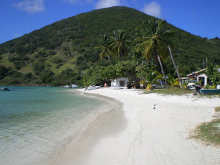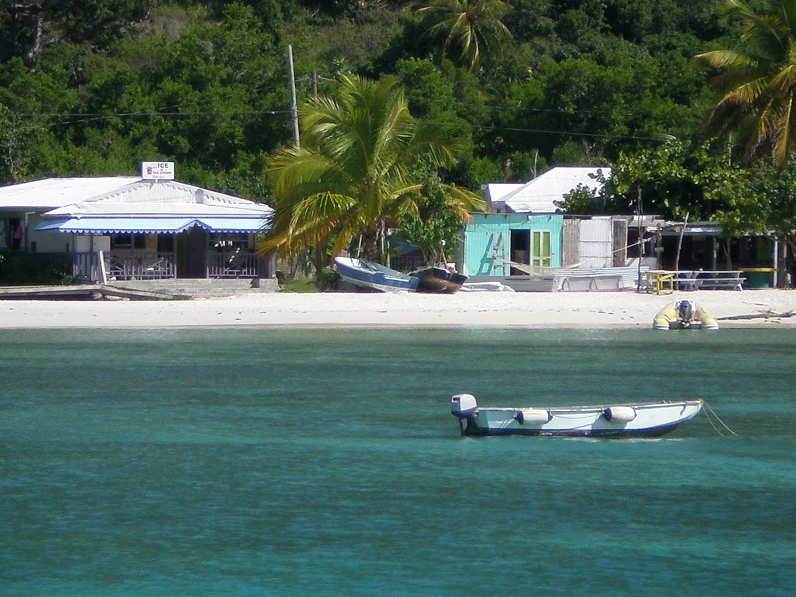 Coconut palms line the beach at Great Harbour. The scenery here is beautiful and the atmosphere peaceful.