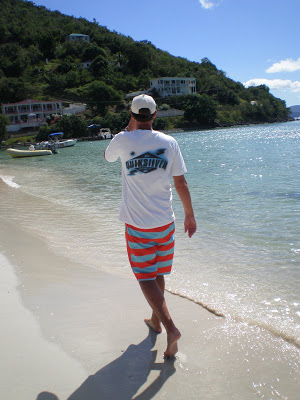 Drinking a Red Stripe and taking a stroll down the beach at Great Harbour.