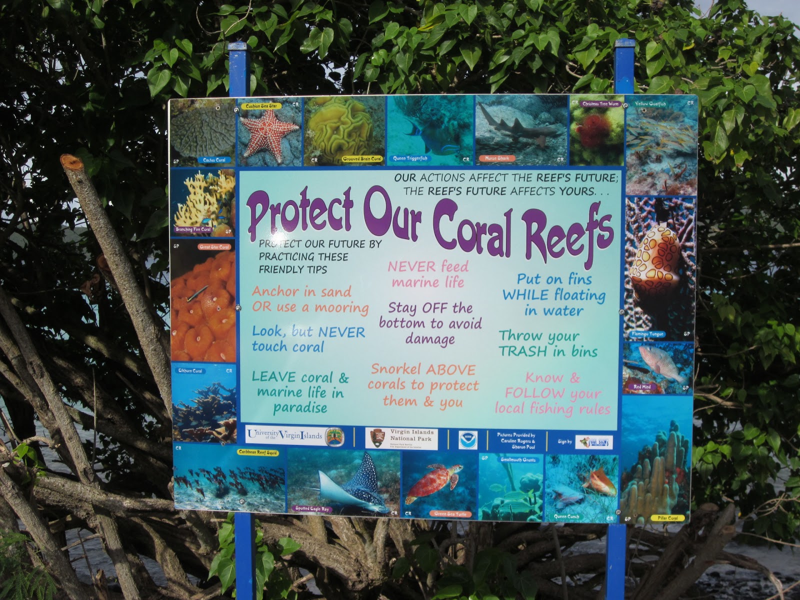 This year the National Parks Service added this reminder for all travelers to be considerate of just how fragile the coral reefs are and how important the reefs are to the undersea nature of the Virgin Islands. This sign is posted on the trail to Waterlemon and I hope the Parks Service will add more of these around the island. Many times I find fishing line and lures tangled in the coral as well as other man made debris. People on top of the water need to understand the damage they cause below..