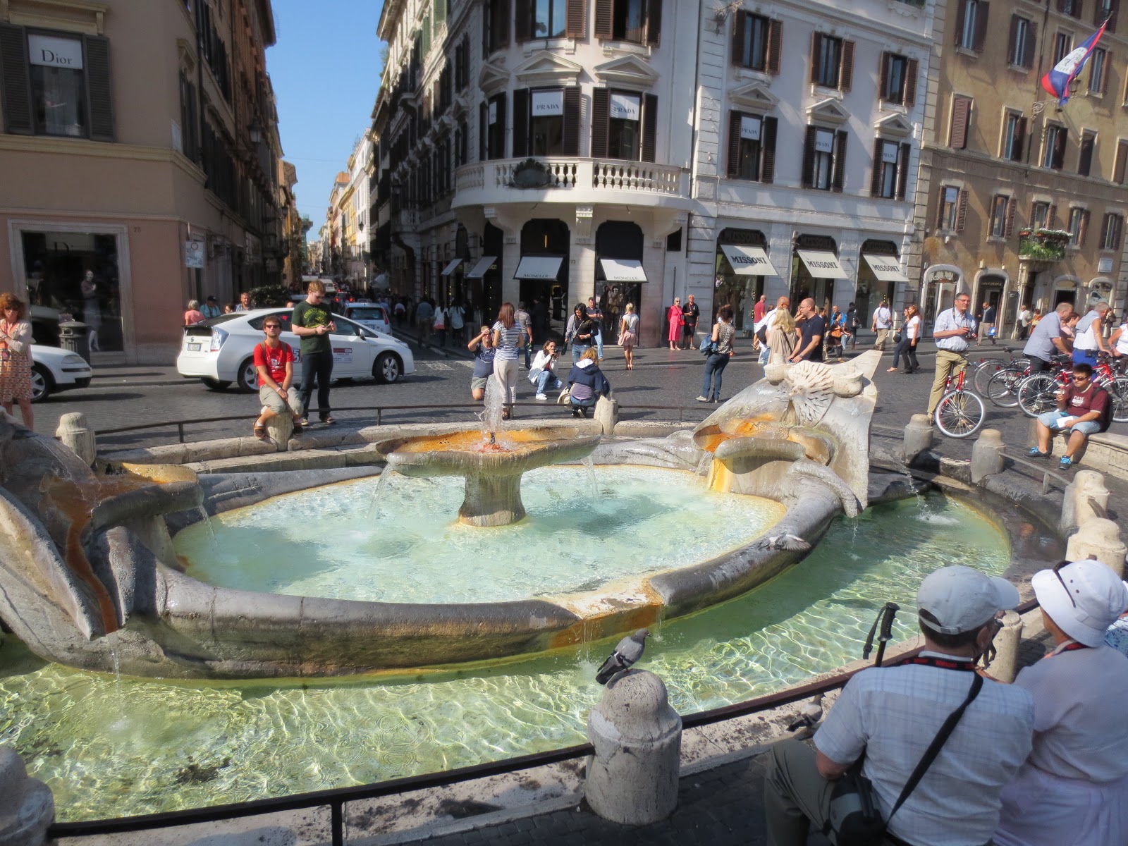 In the Piazza di Spagna at the base is the fountain called Fontana della Barcaccia (“Fountain of the ugly Boat”), built in 1627-29 and often credited to Pietro Bernini, father of a more famous son, Gian Lorenzo Bernini, who is recently said to have collaborated on the decoration.