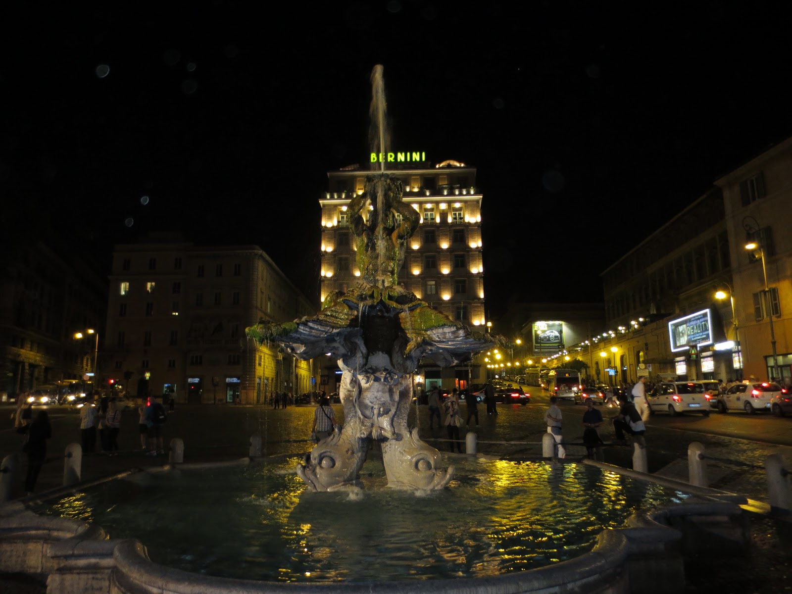Piazza Barberini is full of energy at night as the bars and restaurants along the streets fill up with people and cars and vespas speed by