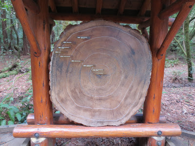 The rings of a tree denote the age of the tree. This slice of redwood is marked at intervals in history going back to 800 AD. It also shows evidence of fires that occurred during the centuries.