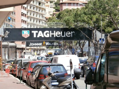 The signs posted over the streets that the famous Monaco Grand Prix is held are visible indicating the course that the race takes.