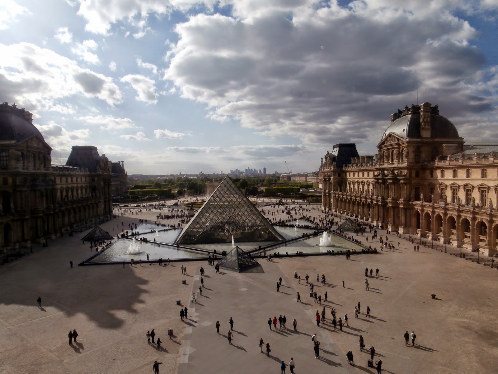 The famous Louvre pyramid in the courtyard surrounded by the palace.