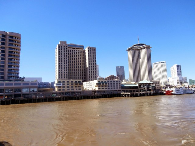 The muddy brown Mississippi River with the New Orleans skyline in the distance. The Mississippi River runs over 200 feet deep in this area with a swift current. During the spring months the river will crest more than 12 feet higher than it does normally.