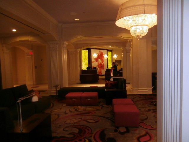 In the lobby the staff hosted a reception with cheese and wine. It was a nice way to start an evening.