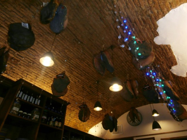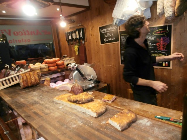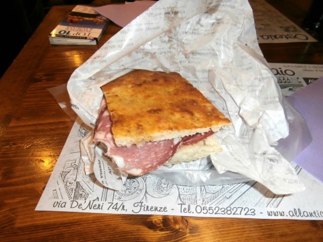 The All’Antico Vinaio is small and charming. From the ceiling hangs dozens of dried meats ready to be cut down and sliced up.