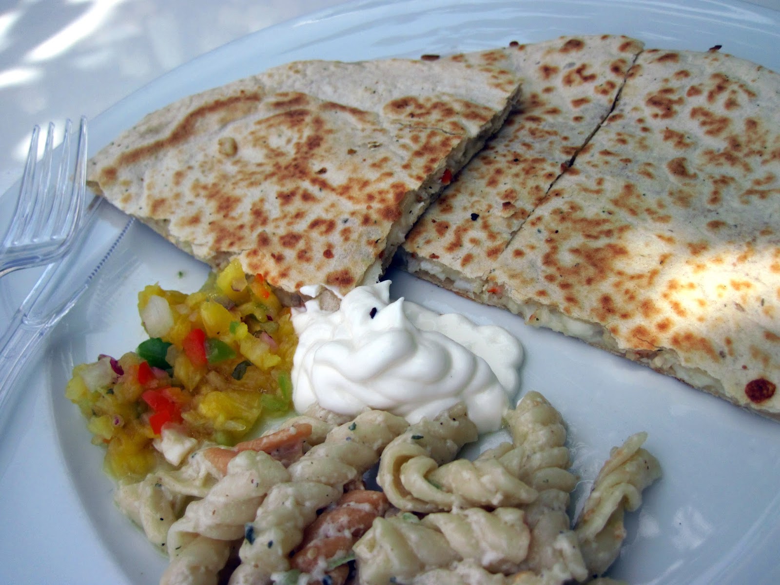 The lobster quesadilla with mango chutney, sour cream, and pasta salad.