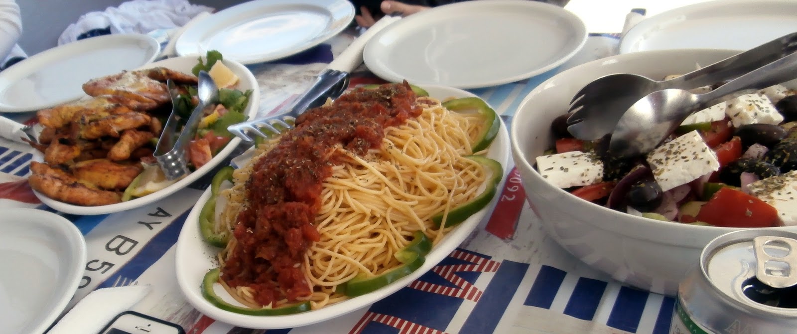 The menu; grilled chicken, pasta, prawns, tzatziki, and of course, Greek salad.