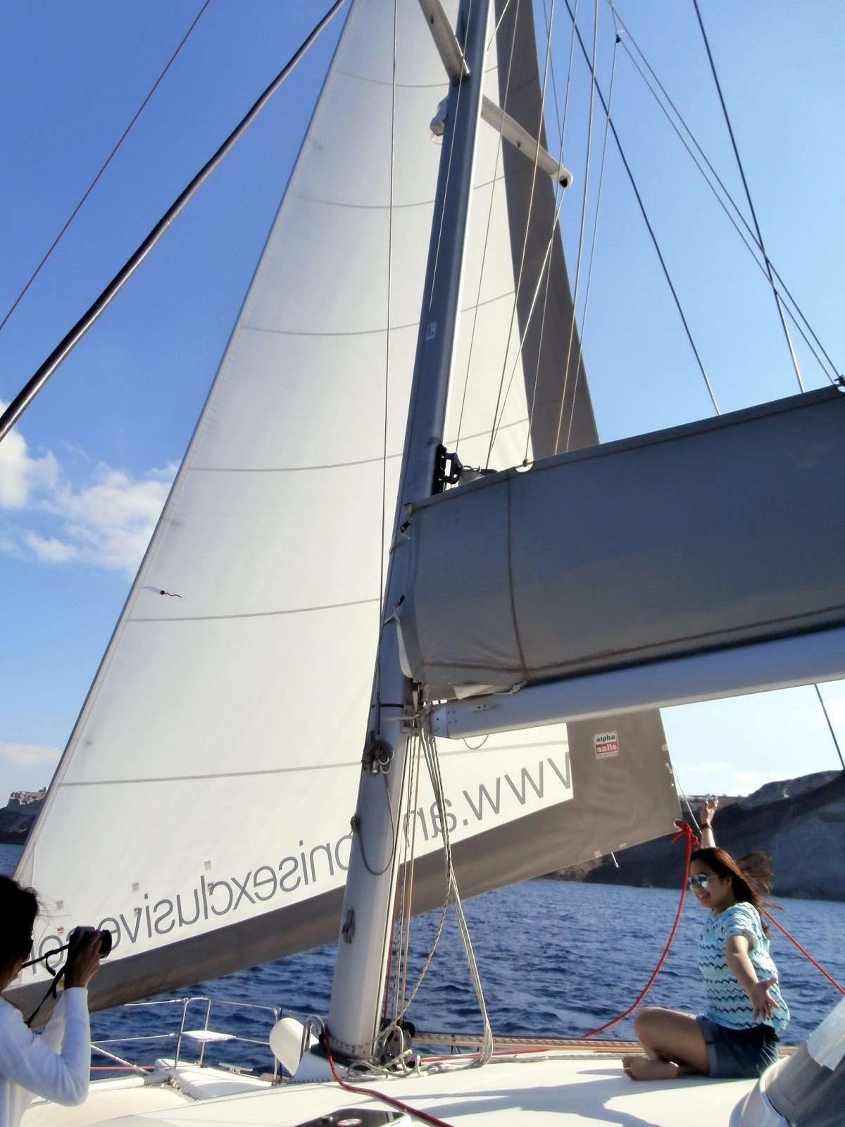 Later the skipper and crew put up the sails and ride the wind into the heart of Santorini caldera.