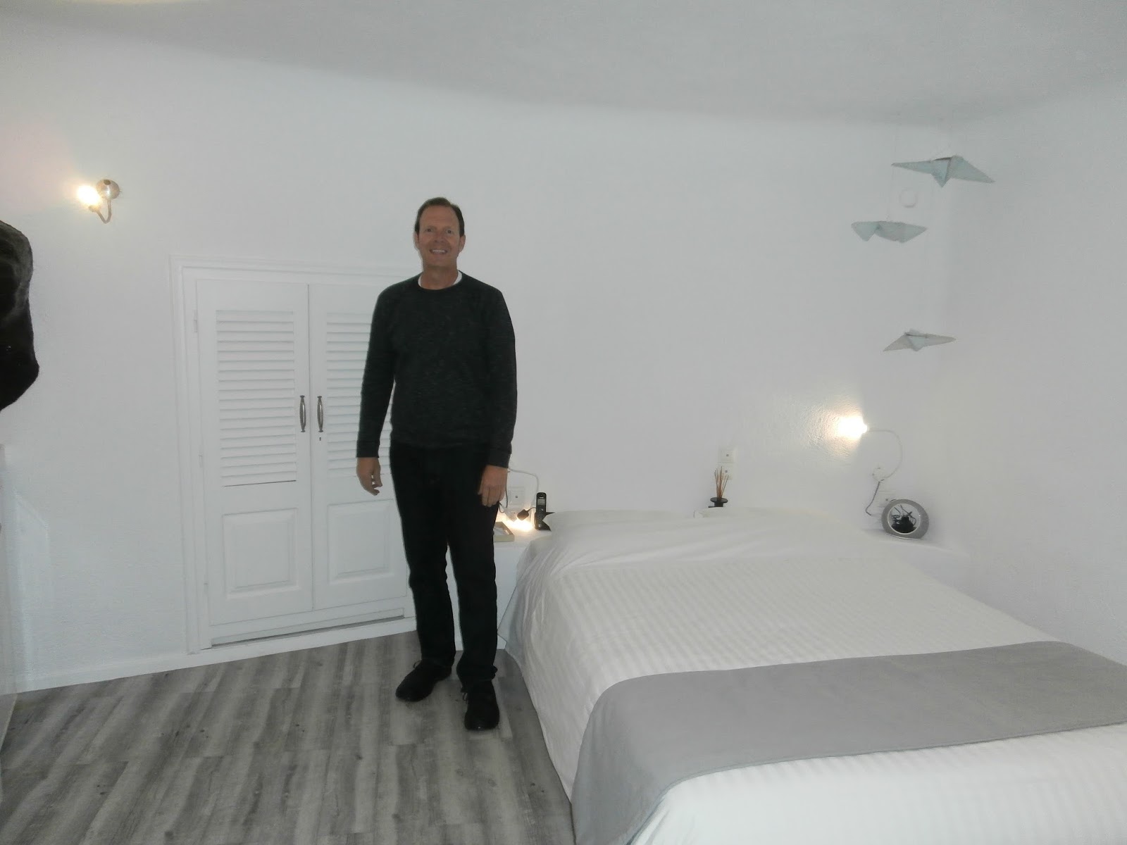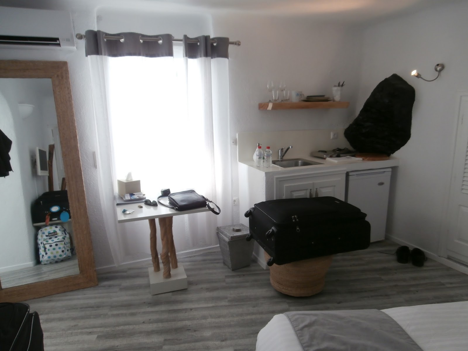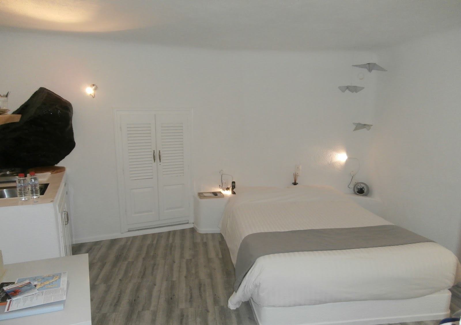 The room was spacious, modern, and clean with the feeling of staying in a rustic Santorini home.