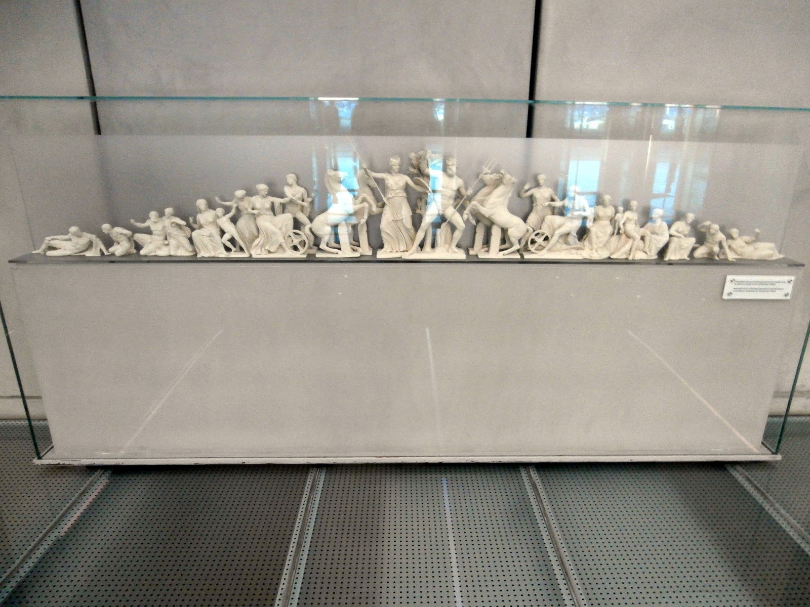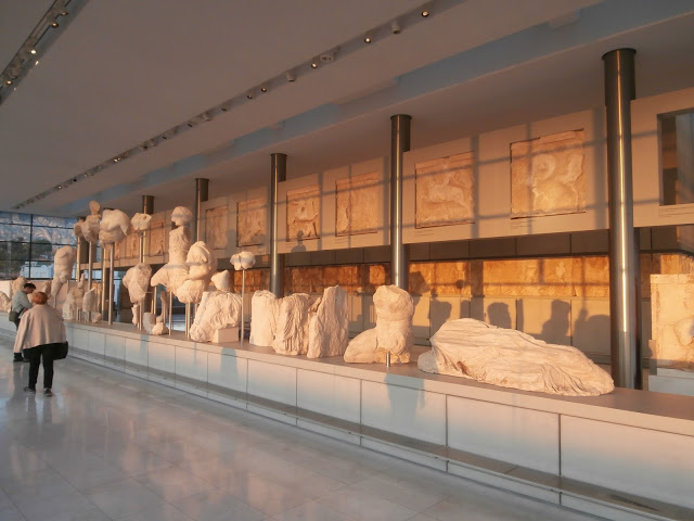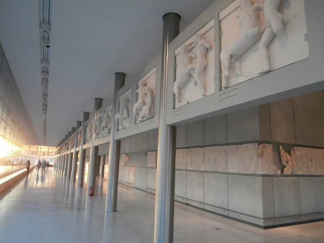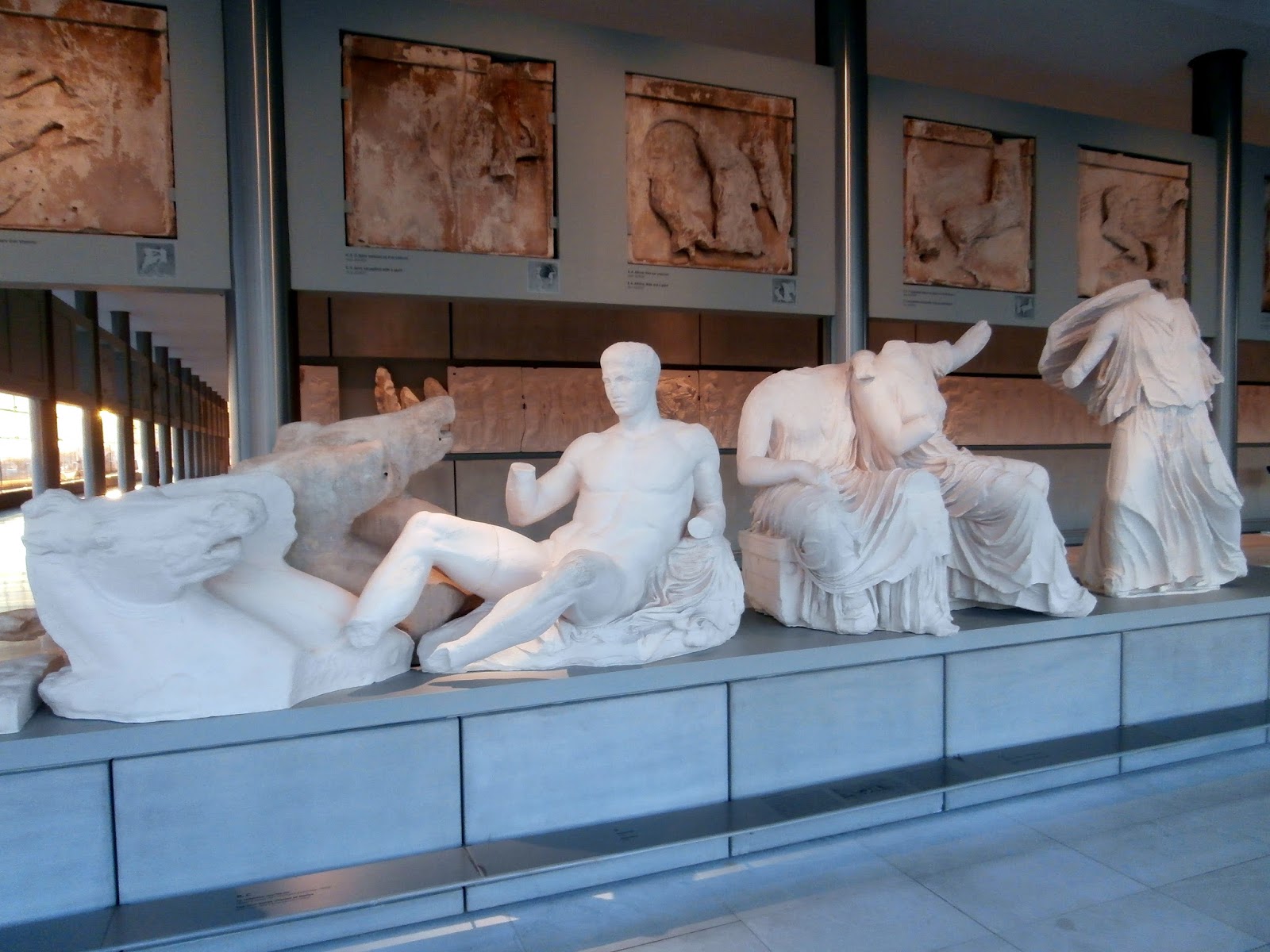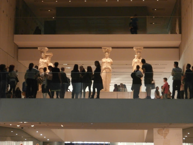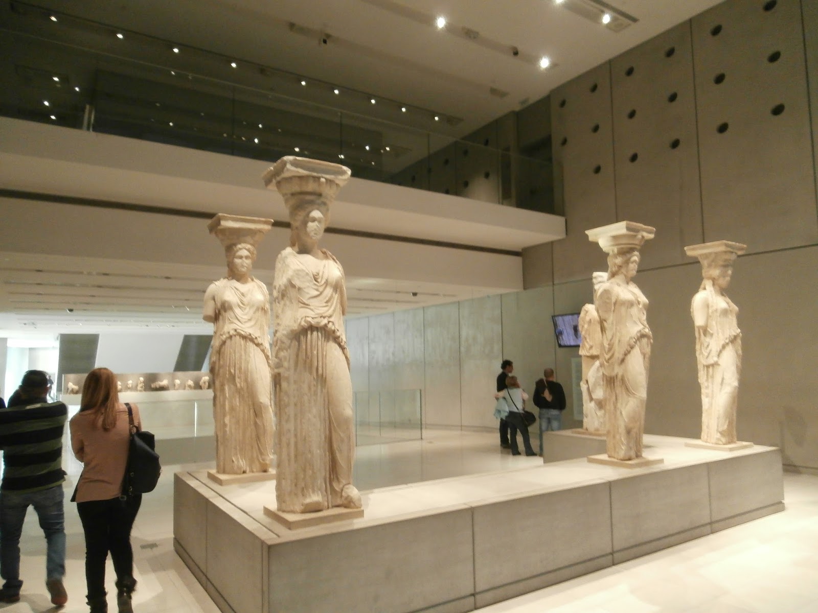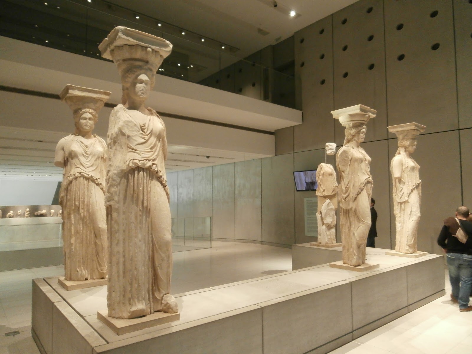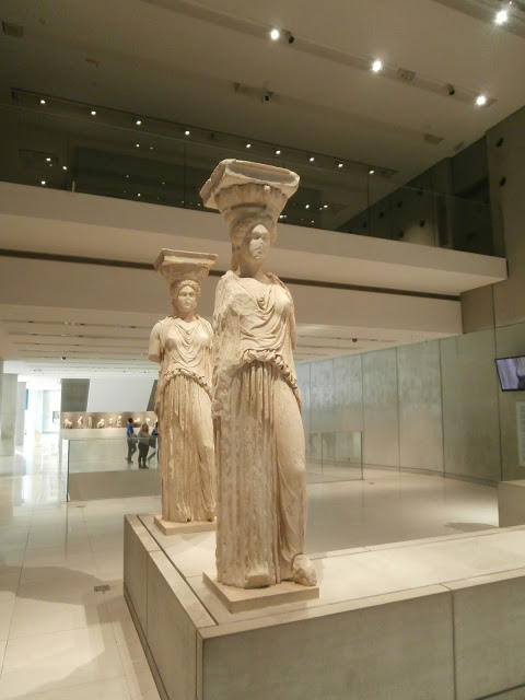 The maidens from the Erechtheum Temple located on the Acropolis. These are the originals now housed here in the museum to protect them.