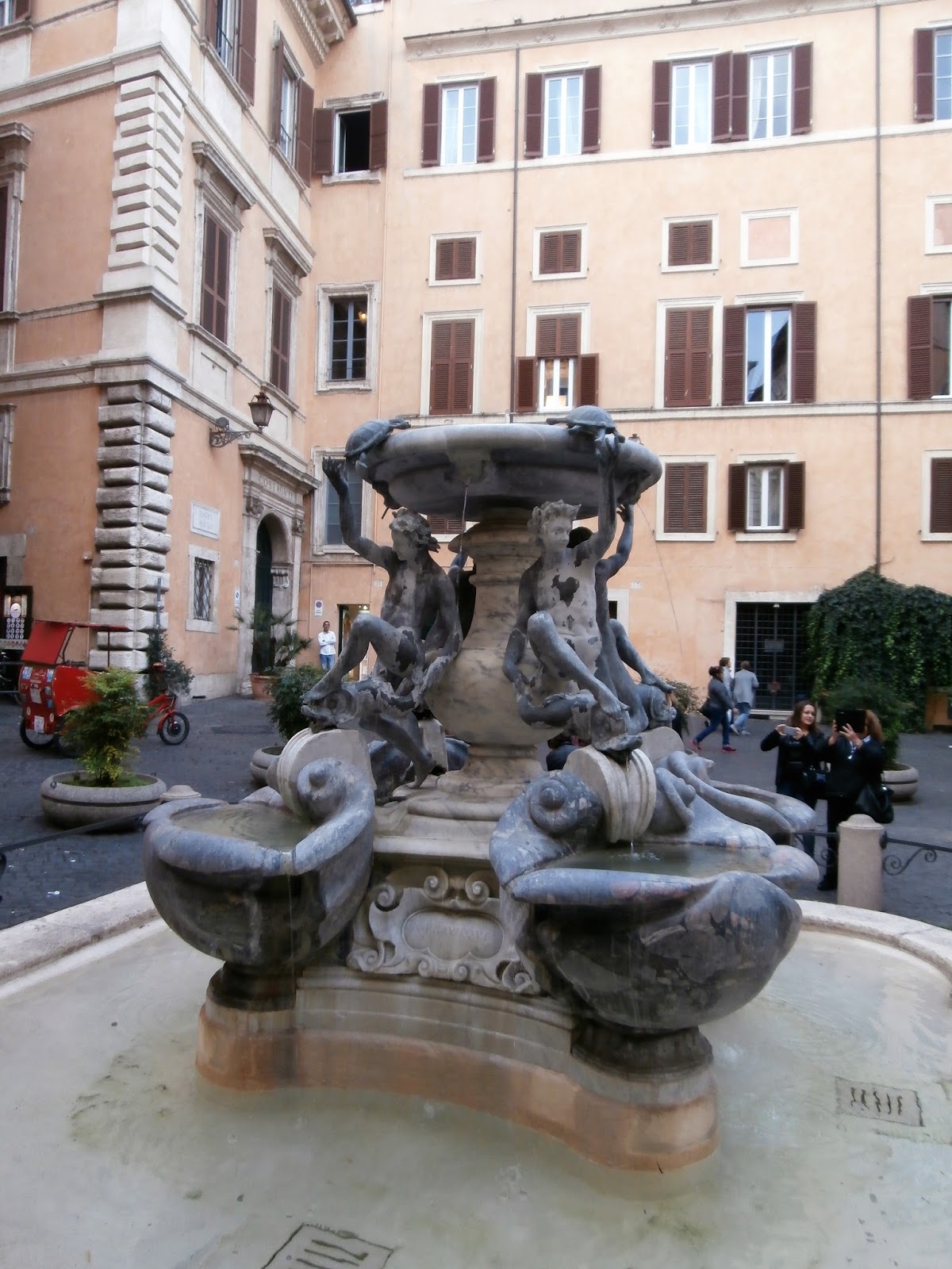 La Fontana delle Tartarughe, The Turtle Fountain, is one of my favorite fountains in Rome. Located in the Sant’Angelo District of Rome it resides just beside the Jewish Ghetto neighborhood. Seek this beautiful treasure out as it can be easily missed. It is truly a treat. Here yours’ truly in a picture moment.