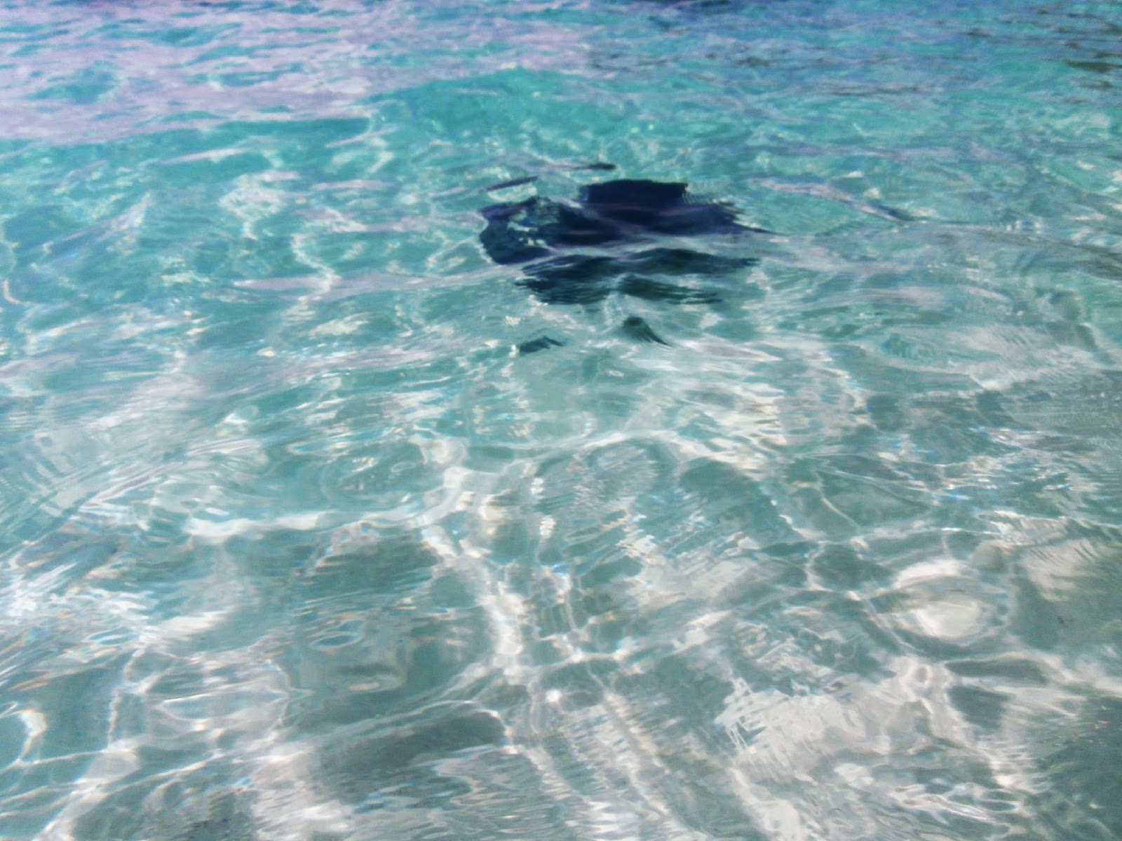 Just a few feet off shore a friendly sting ray skims the bottom in search of a meal.