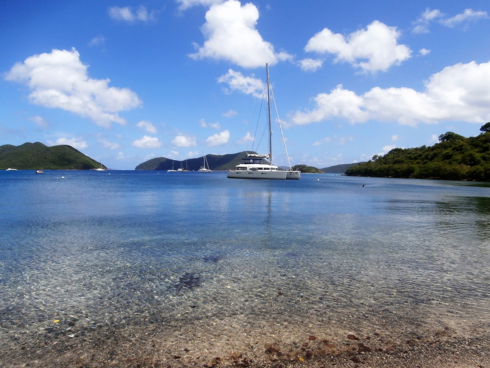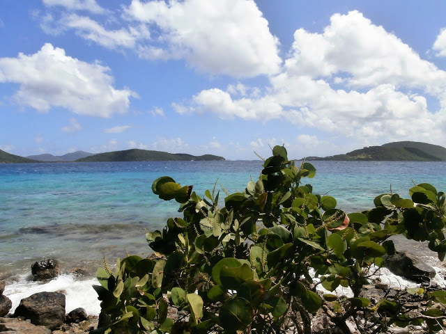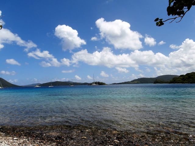Standing on the beach and looking straight out you can see Tortola in the far distance and a little closer the small cay called Waterlemon Cay.