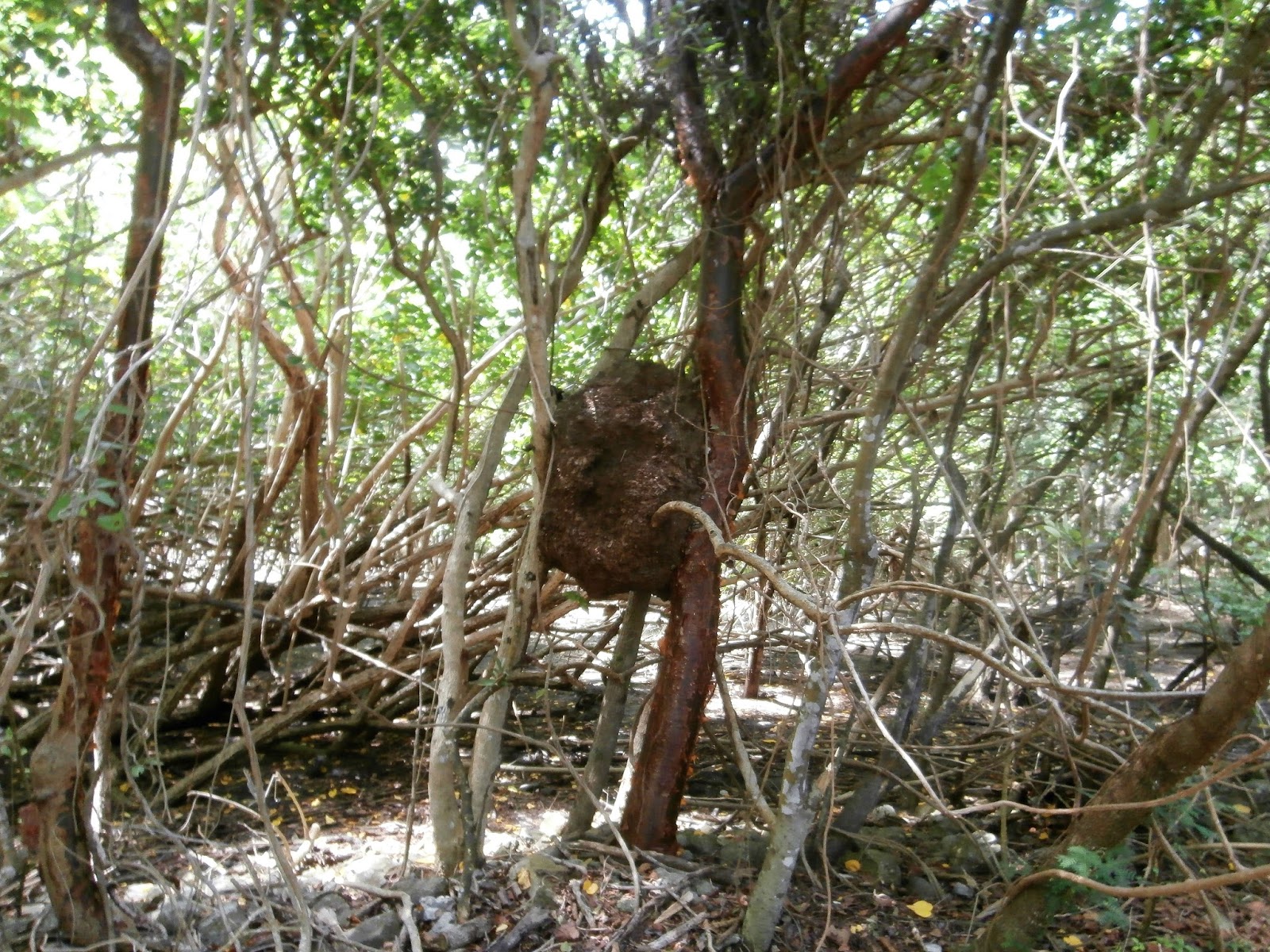 All over the island you may notice these large ‘blobs’ of mud stuck on the trunks of trees. These are the ants and termites that build their nests off the ground in order to stay dry.