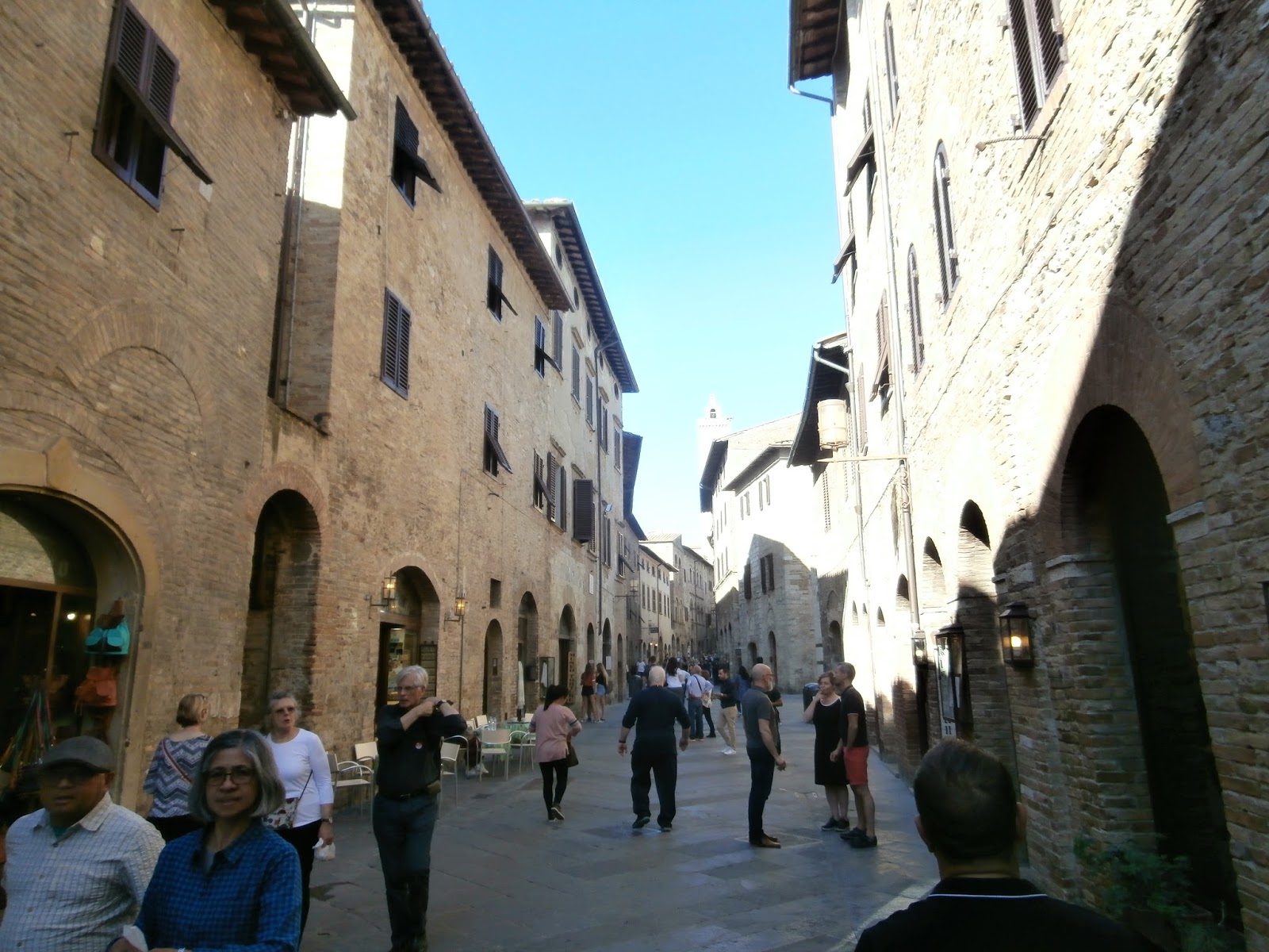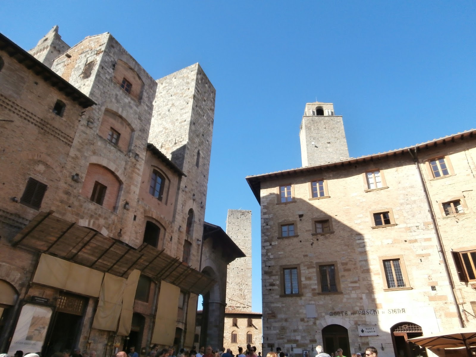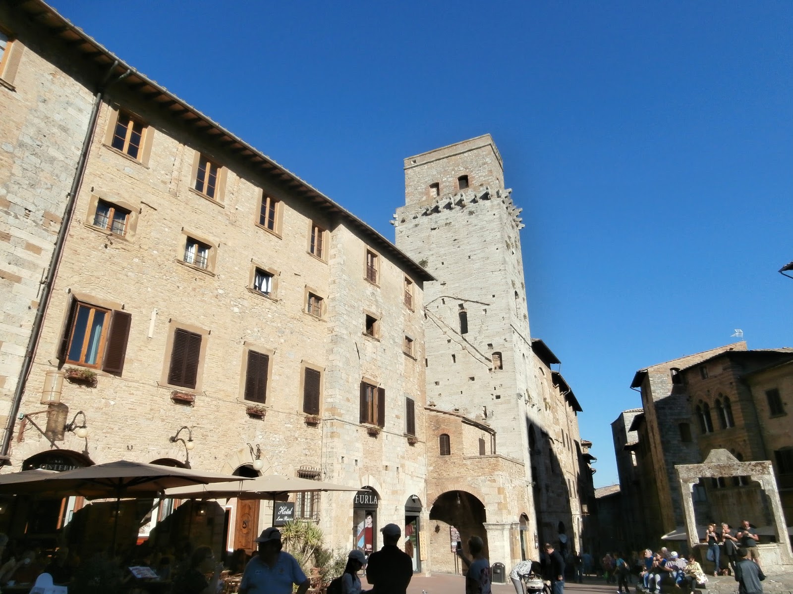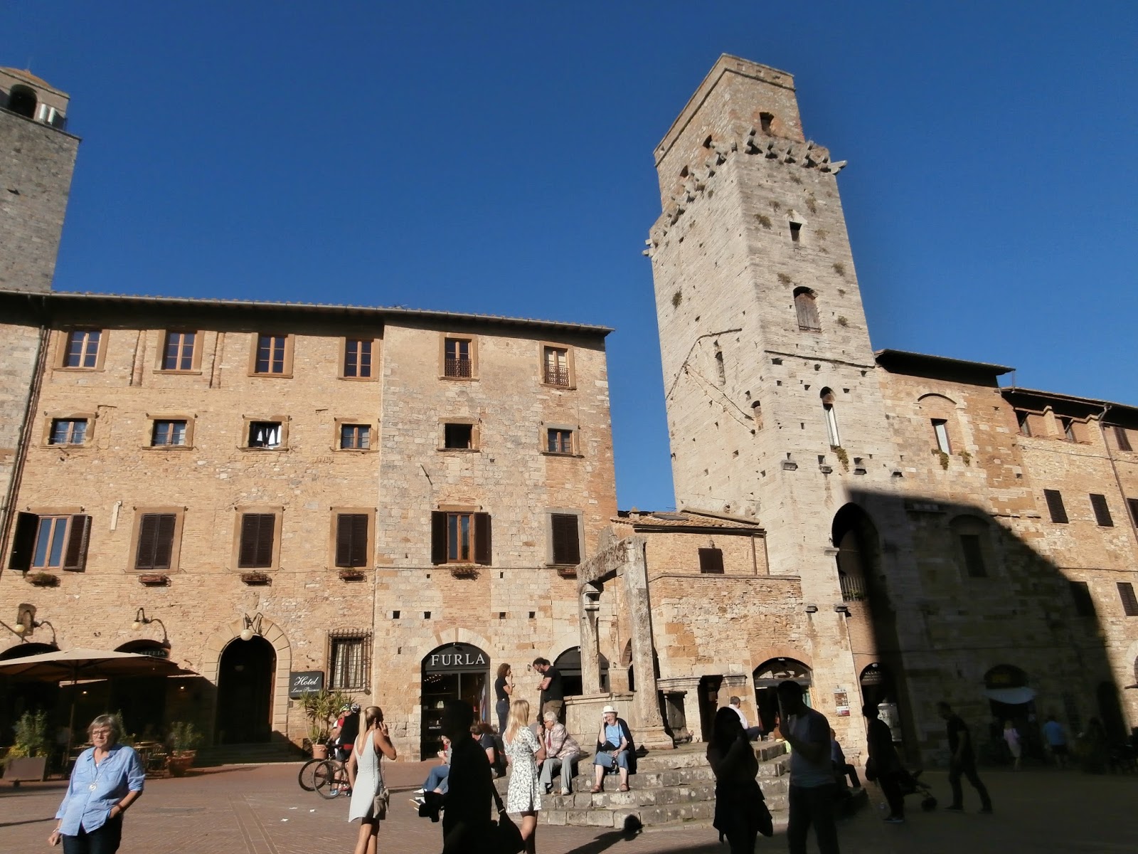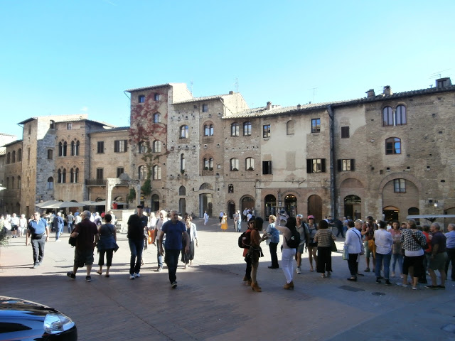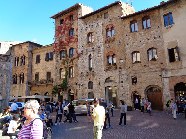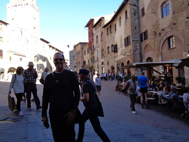 The main piazza of San Gimignano bustles with tourists and locals alike enjoying a cold beverage or gelato.