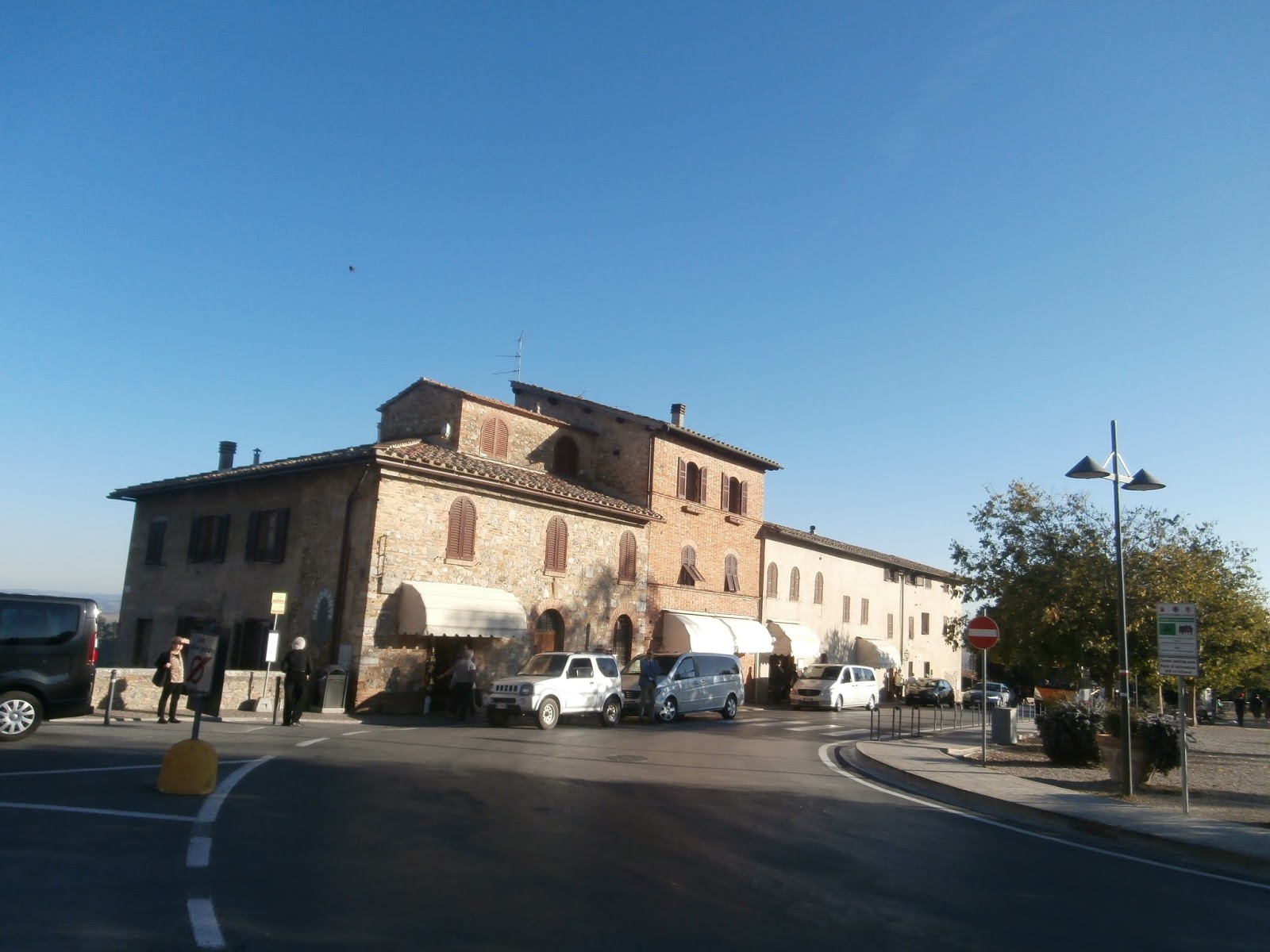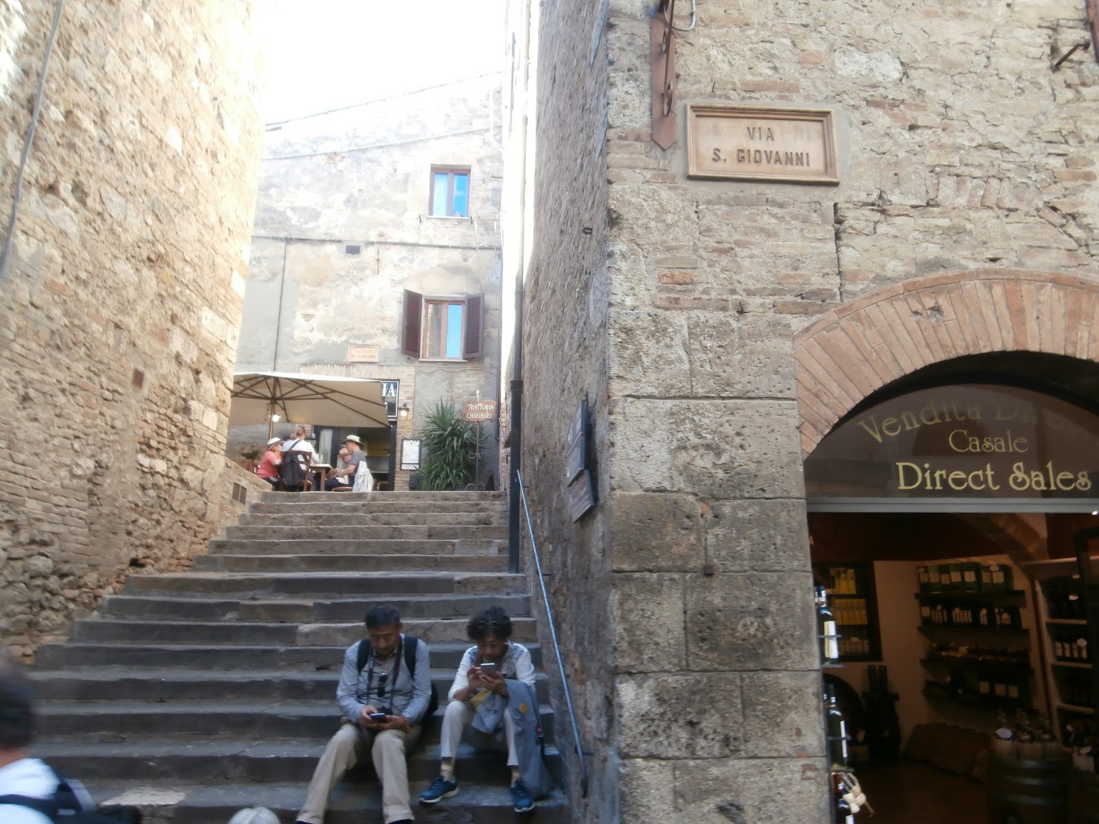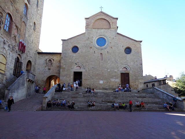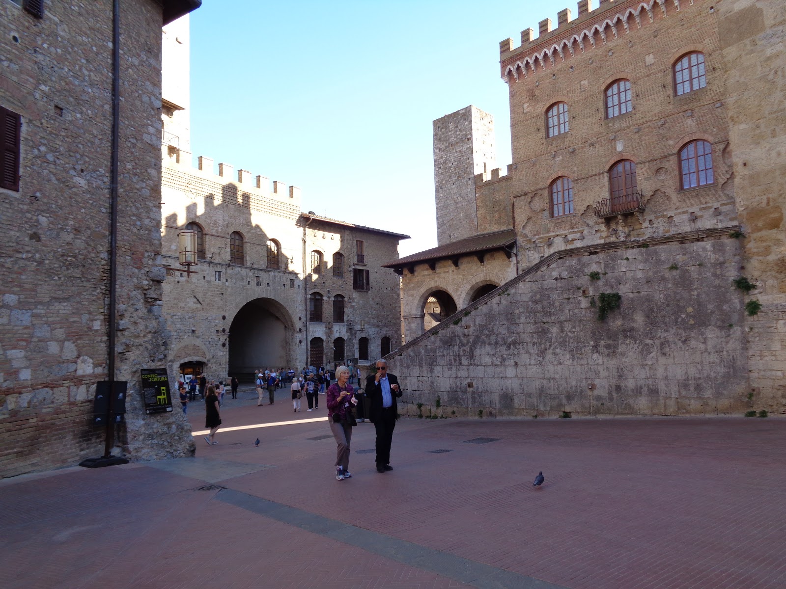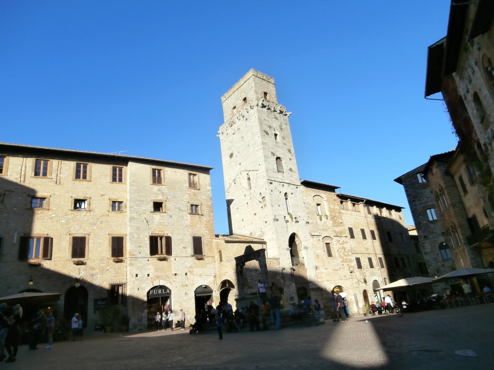 The main piazza of San Gimignano bustles with tourists and locals alike enjoying a cold beverage or gelato.