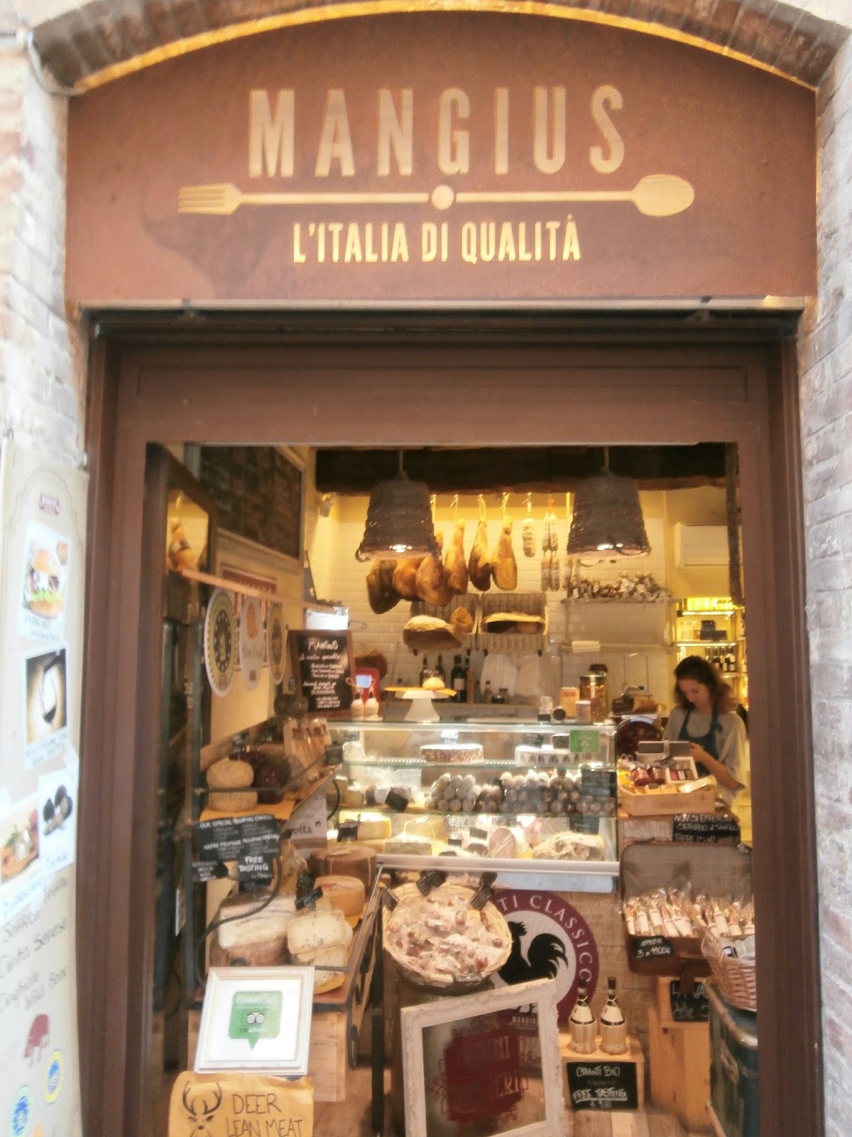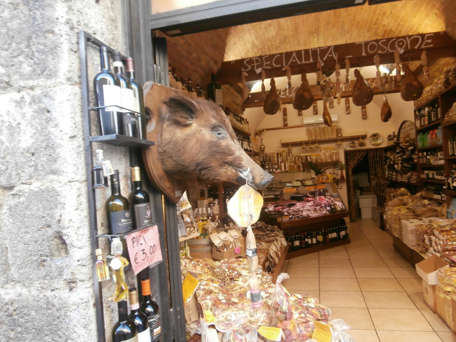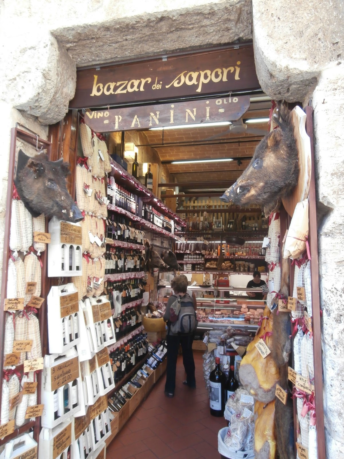 San Gimignano has many shops filled with meats, cheeses, and wines from the local area. Just walking into these stores you are met with the wonderful earthy smells of the meats and cheeses.
