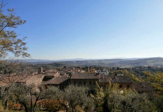 The countryside around San Gimignano is rolling hills of vineyards and olive trees.