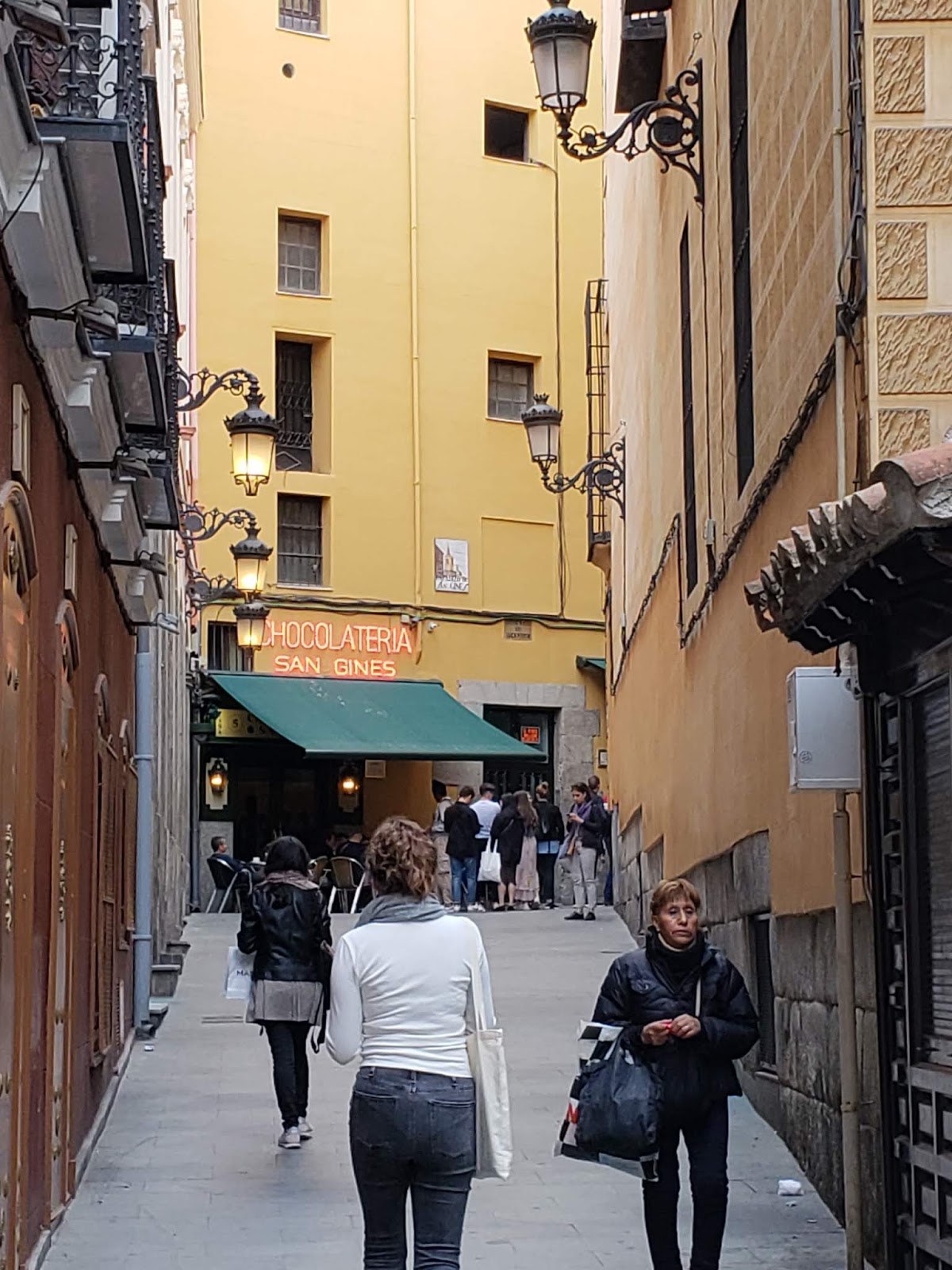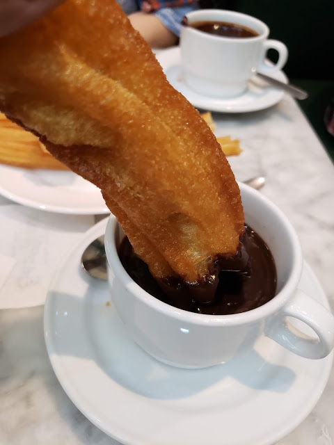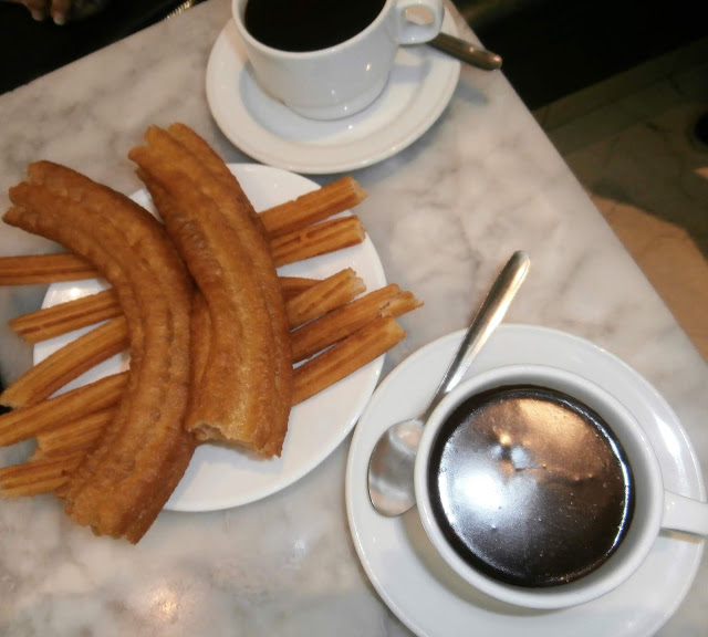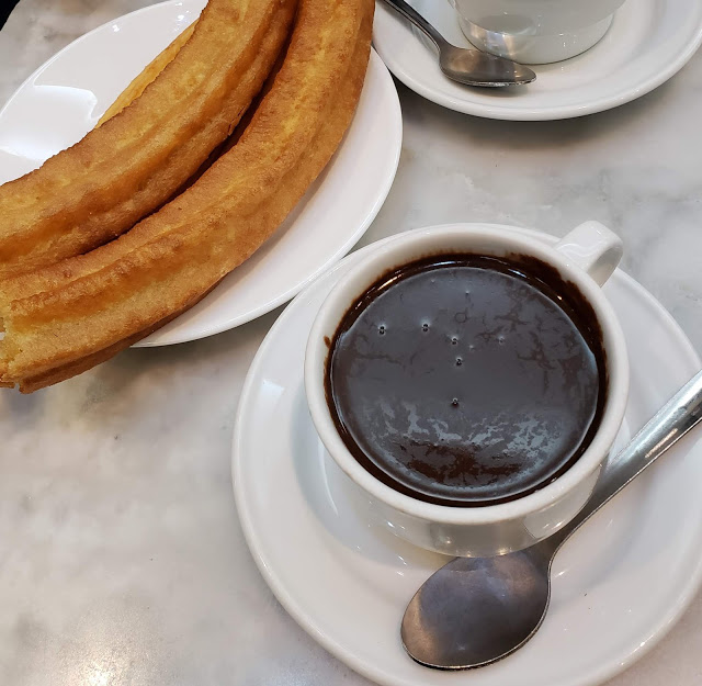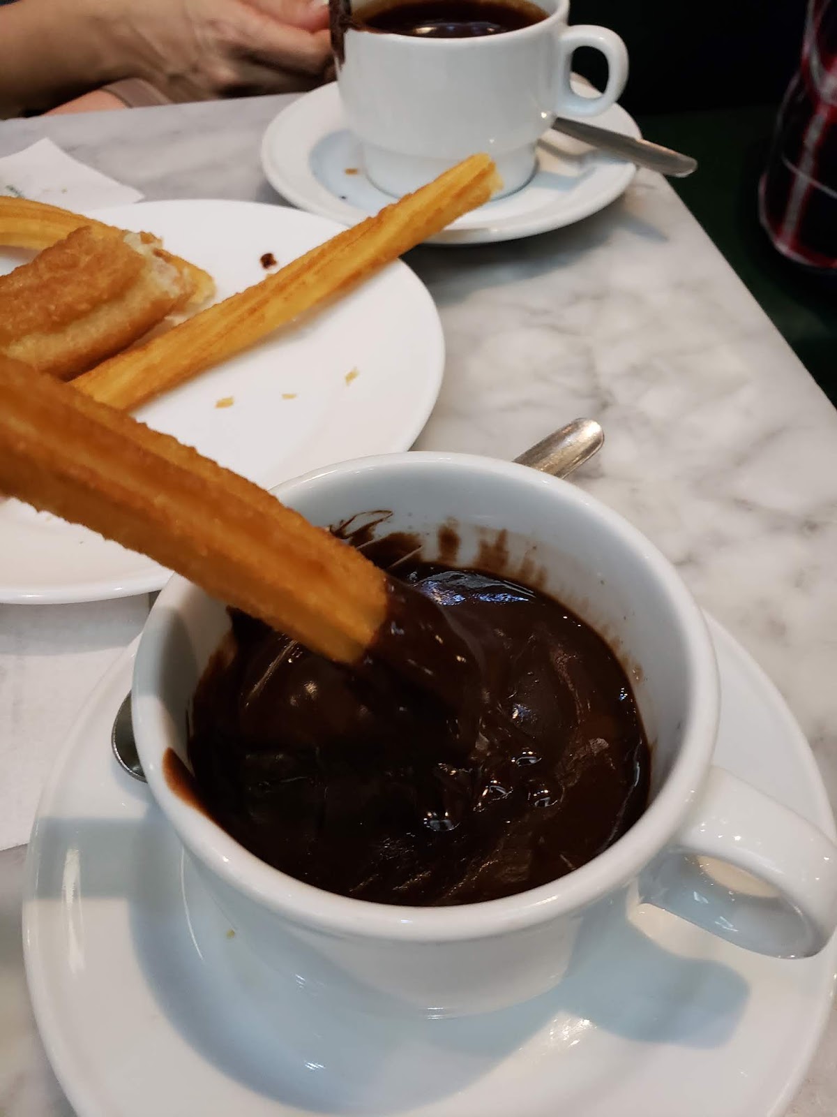 Chocolateria San Gines has been serving up hot chocolate with churros since 1894 in the heart of Madrid and should be on everyone’s list of places to visit and eat when visiting this beautiful city. In fact, I went two times during this stay! Located just a few minutes from the Puerto del Sol, Chocolateria San Gines is open every day serving the best hot chocolate and churros you will ever have eaten. They serve two sizes of churros so be sure to ask for both! My favorite is the large churro… Be prepared to wait in line for a few minutes as the it gets a little crowded in the evening hours, but it’s worth the wait. Just walk up, order, take your receipt to a table and present it to a waiter. In a moment you are served delicious hot chocolate and churros.