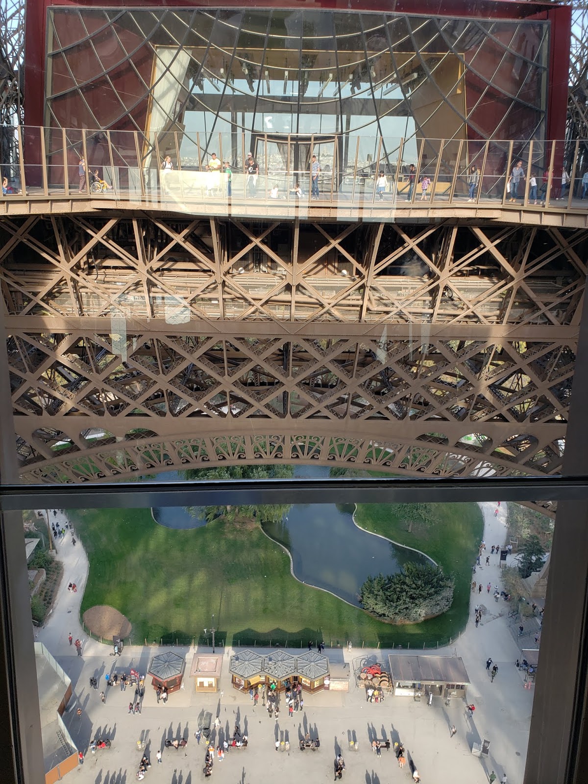 Looking down through the glass floor on the first level of the Eiffel Tower.