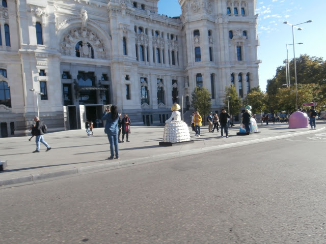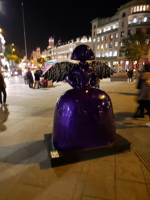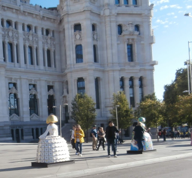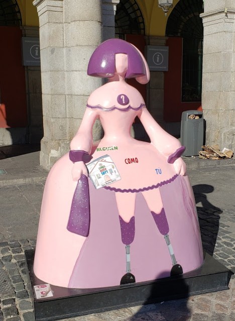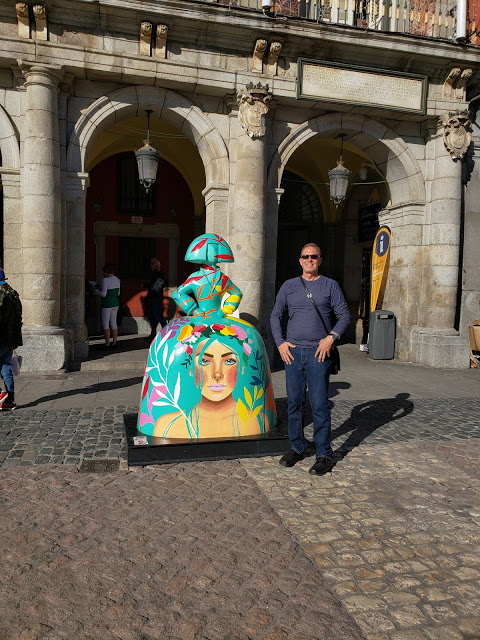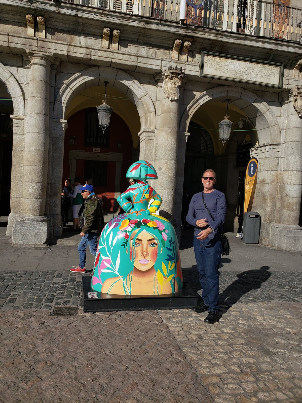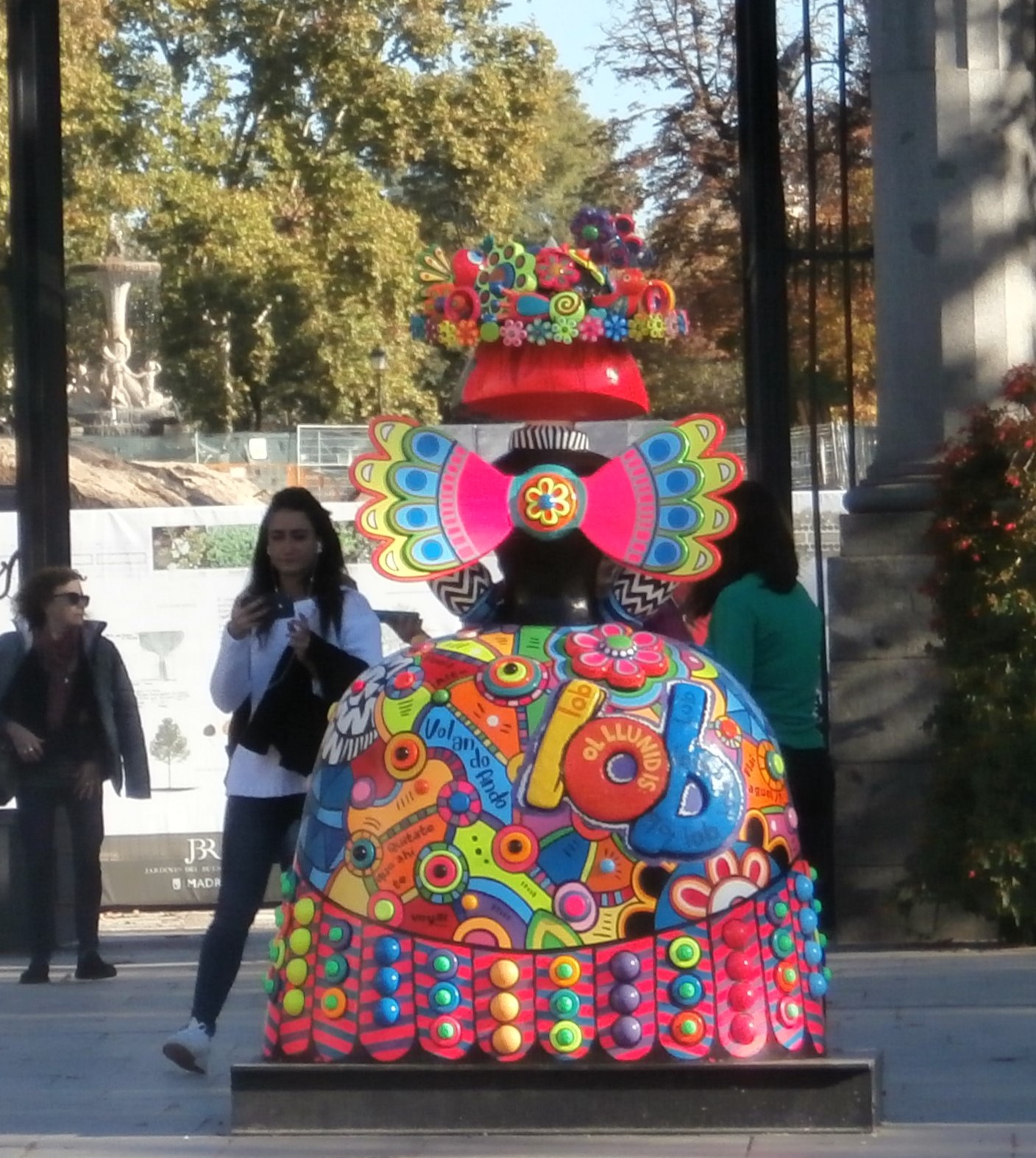 The statues are about 6 feet tall and are made from fiberglass. Each commissioned artist is at liberty to use the statue as a canvas to share original concepts. Eighty such sculptures are placed in prominent areas all around Madrid and will be on display thru July 2020 at which time they may be put on display in other cities around the world.