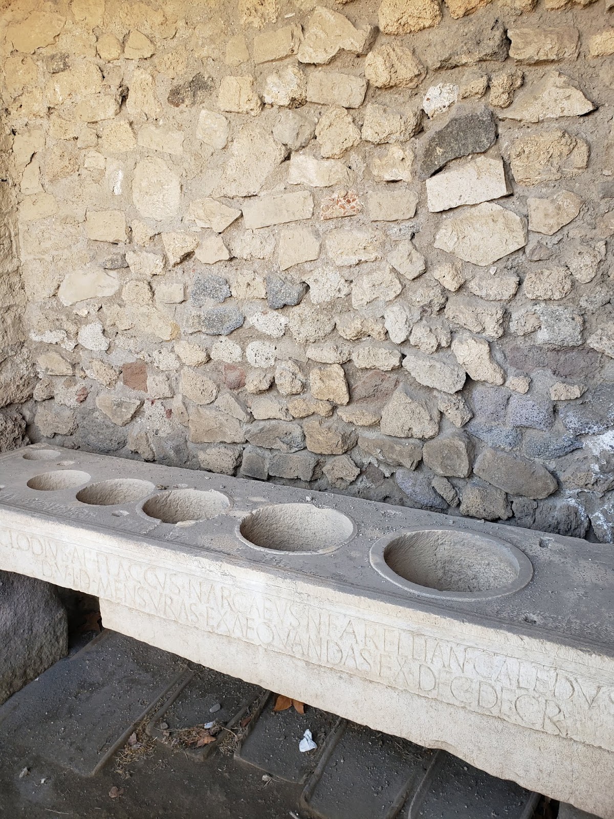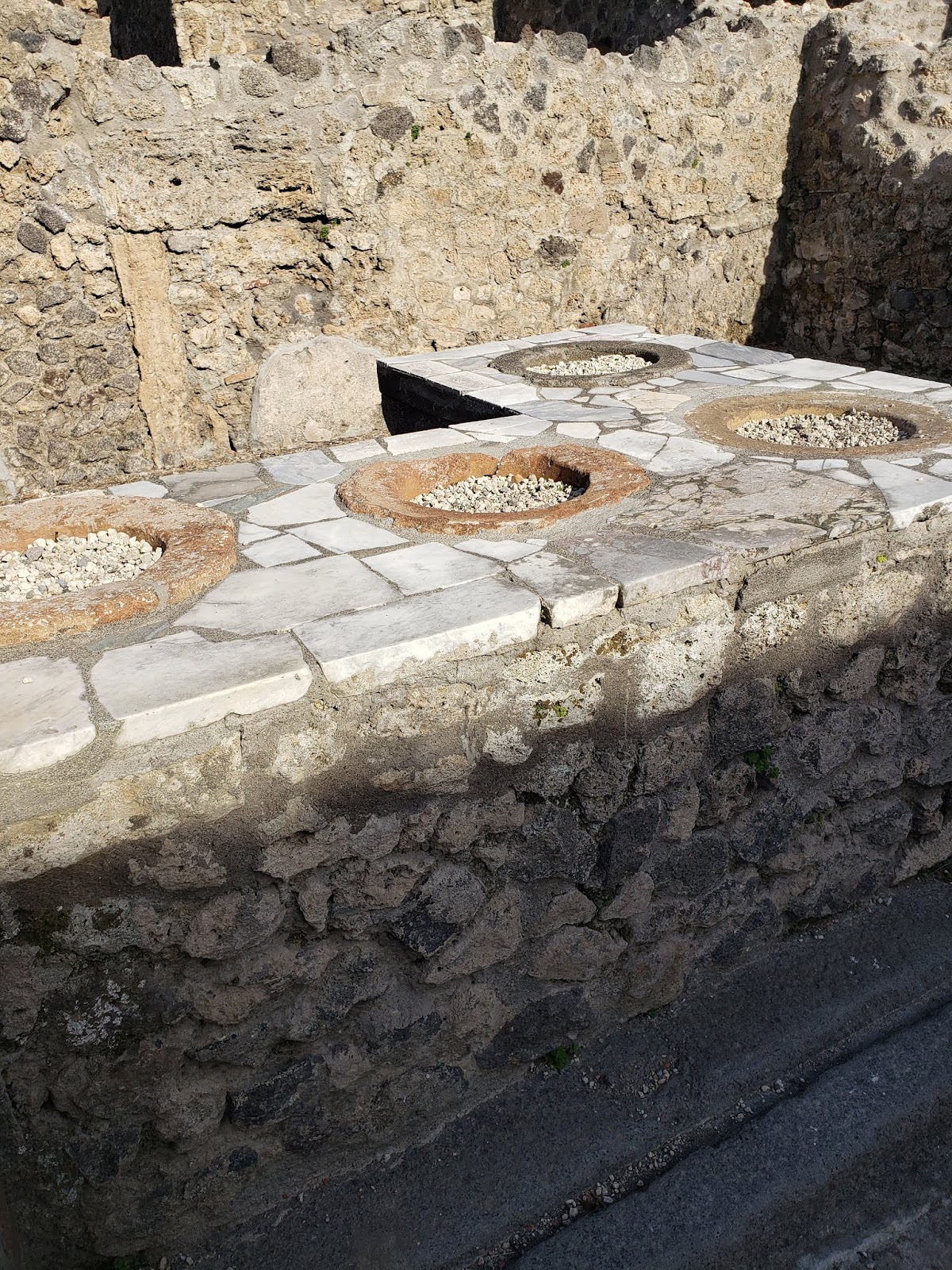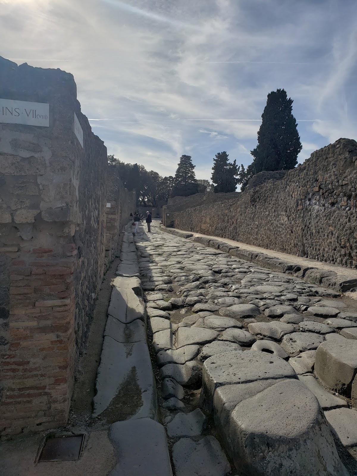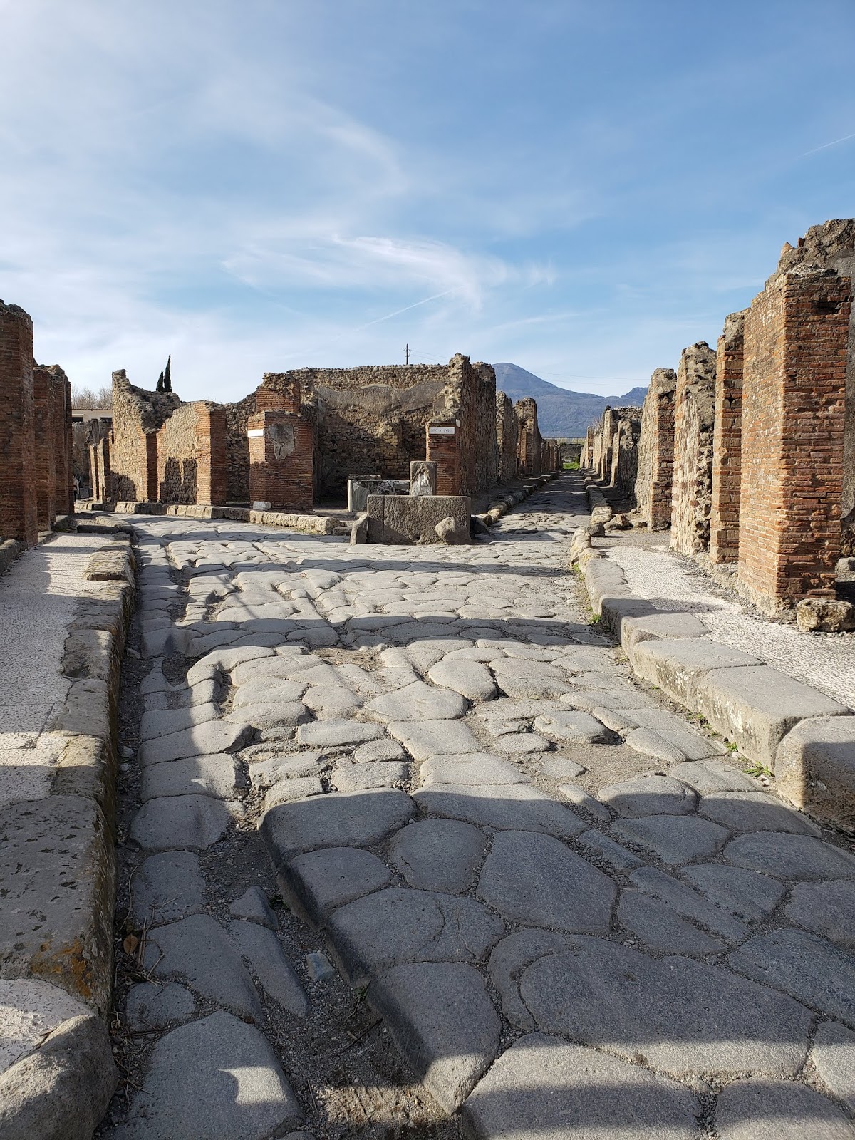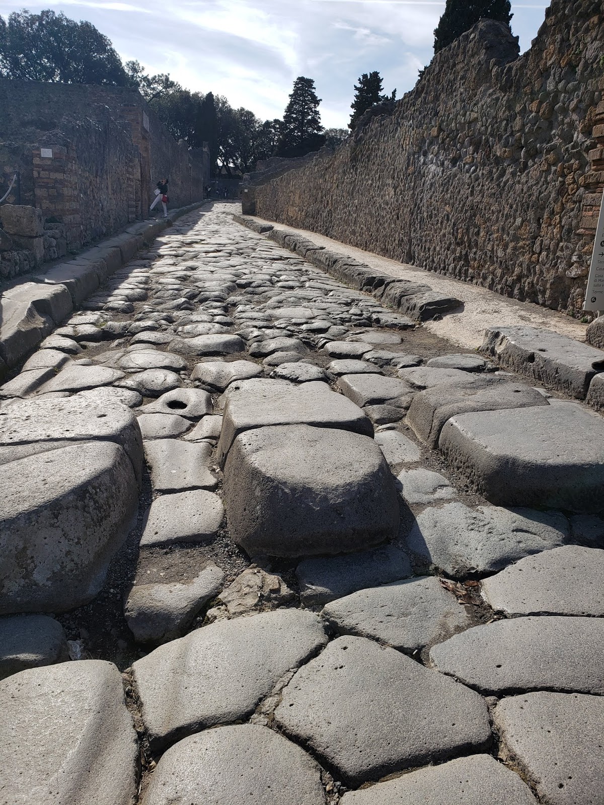 The streets of Pompeii are laid out and engineered in true Roman fashion. Water would have flowed in the streets and at every intersection large ‘crossing stones’ were placed to allow pedestrians to cross the streets without getting wet. Gaps between these stones were strategic to allow for wagons to pass without obstruction also.