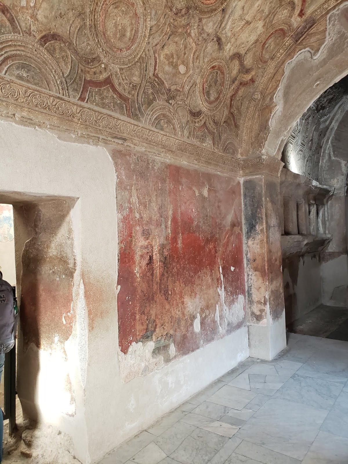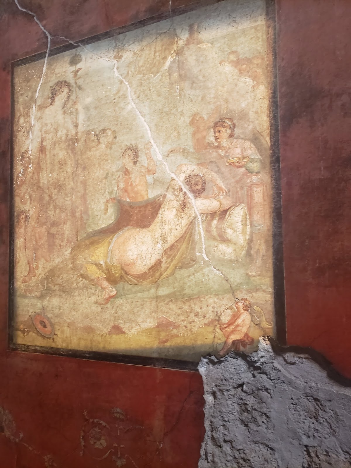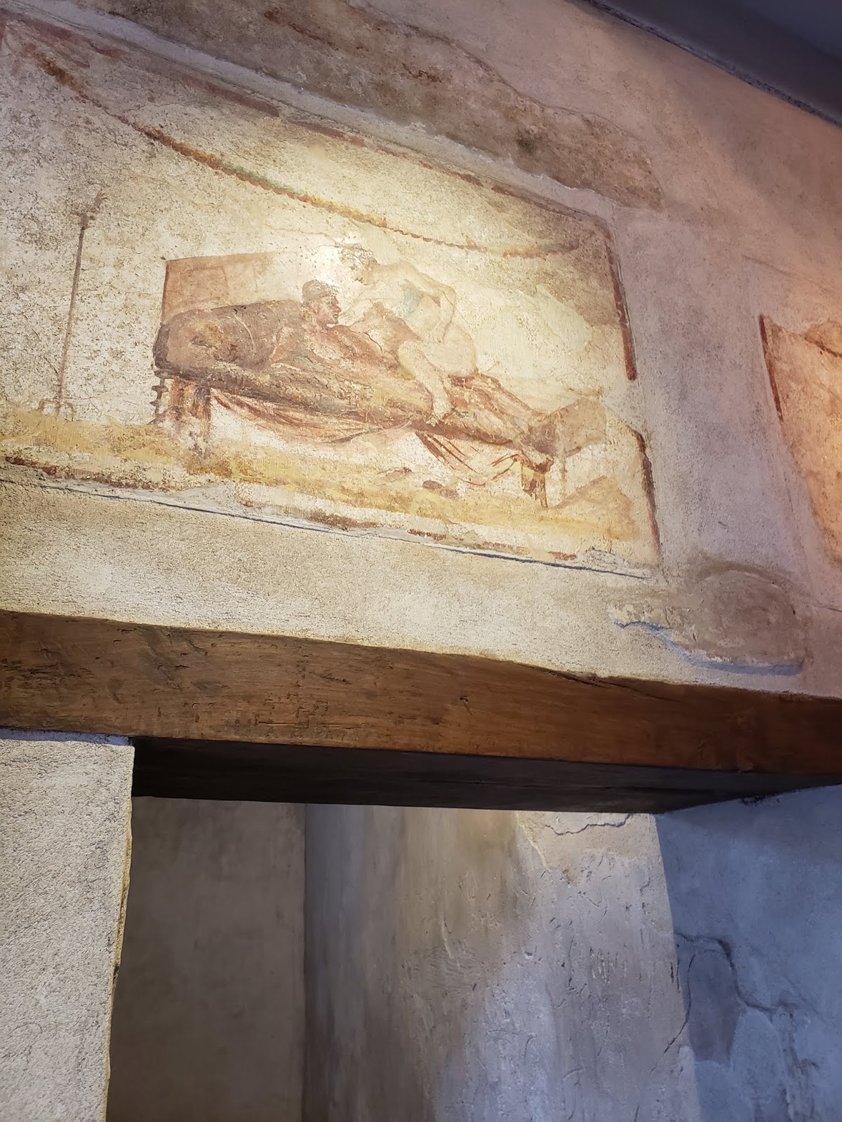 Pompeii has many famous buildings and pictured here is the inside of one it’s most notable. Pompeii’s famous brothel. Murals on the wall survived to illustrate what would have been scenes playing out inside one of the many bed chambers.