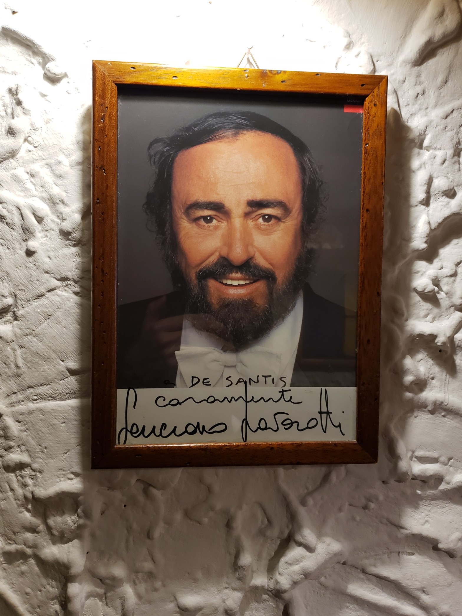 I ordered my panini and an Italian beer at the counter, paid, and sat down to wait for my sandwich. Although it was not crowded I had company at my table as I glanced to the wall and noticed an autographed portrait of Pavarotti grinning back at me. Apparently De Santis has a history of feeding famous Italians from soccer players to singers, actors, politicians, and now me. Other celebrities autographed photos adorned the wall and I contemplated where mine would end up.